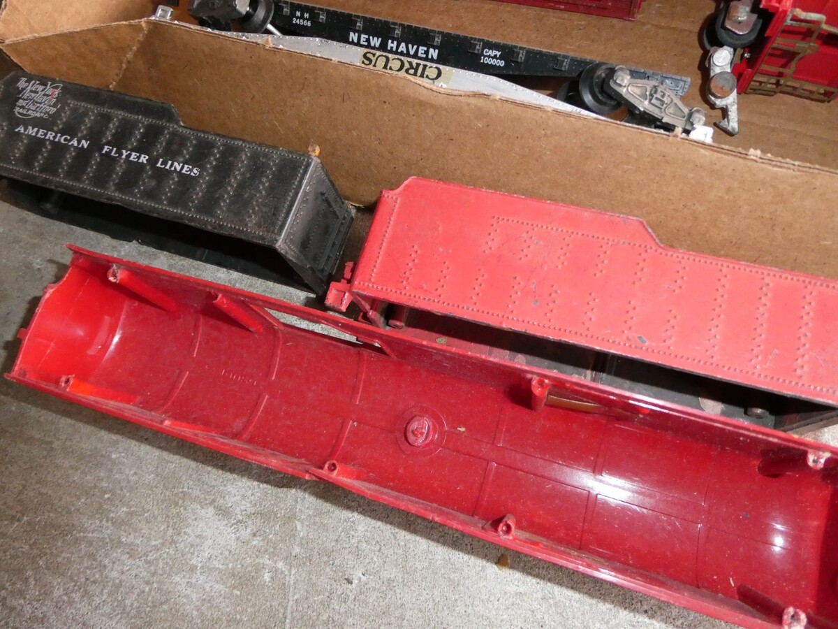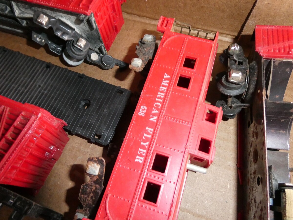 You are bidding on a vintage American Flyer, lot of 10 incomplete cars and/or car bodies, in the pictures. Used lot with various degrees or wear, all damaged and missing parts, some rusting, sold for parts or repair, all could use a cleaning. Zoom in for details.
