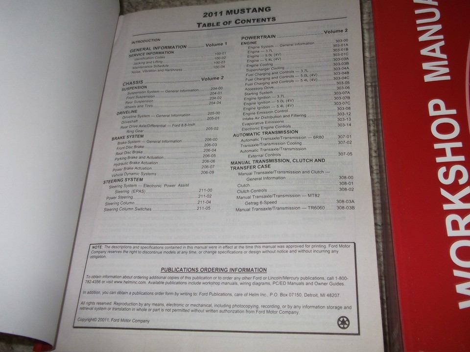 Manuel d'entretien d'usine FORD MUSTANG 2011, ensemble de 2 volumes et manuel des schemas de cablage electrique.
