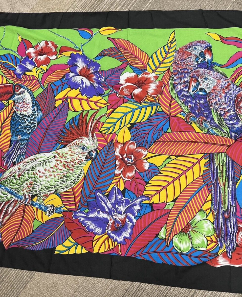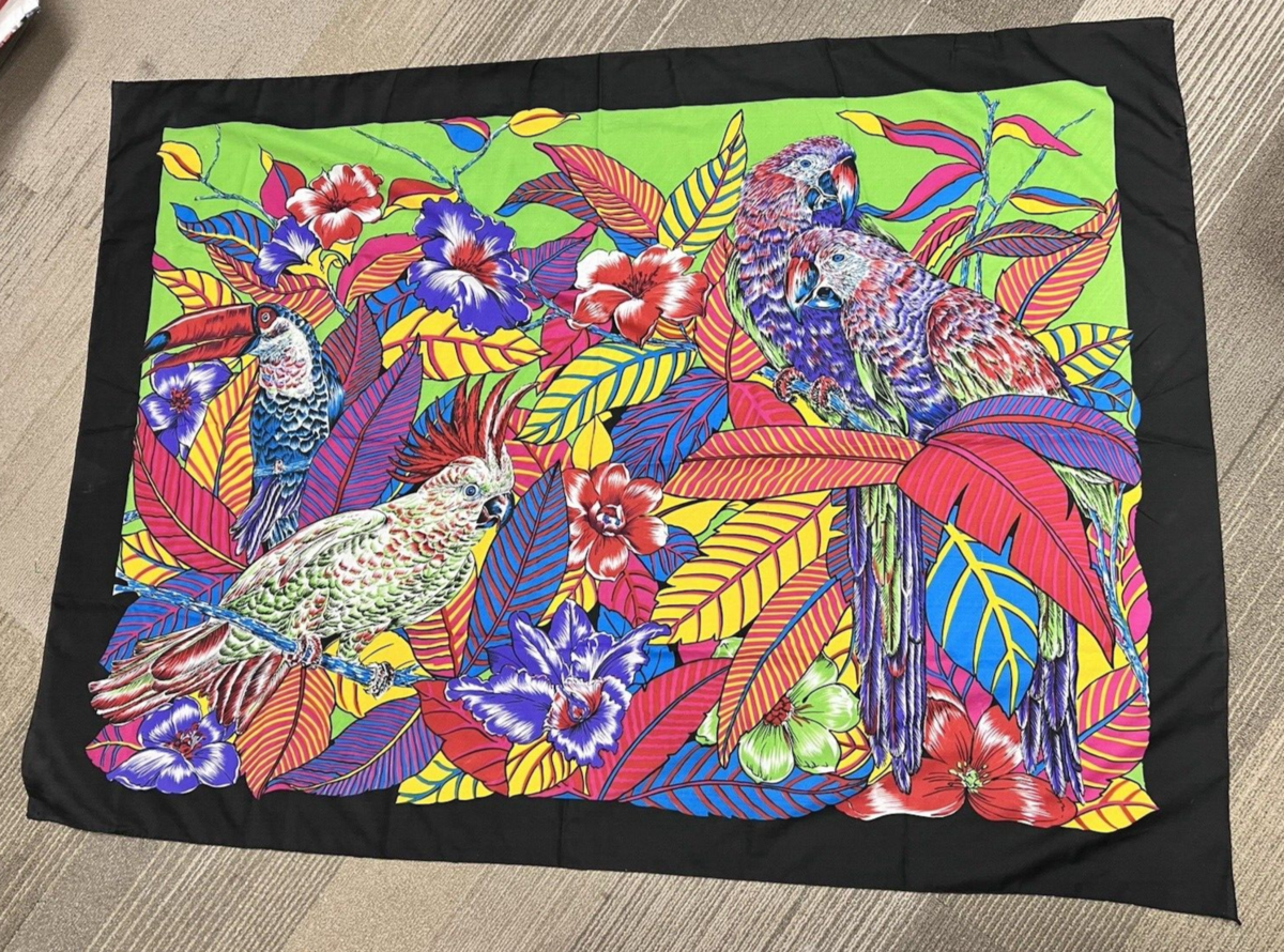 Very Large Exotic Bird Scarf Colorful Bright Parrot Cockatoo 43 x 60 Silky NoTag it has no tags also there one or 2 single thread pulls see close up you don't notice from afar no holes just normal wear