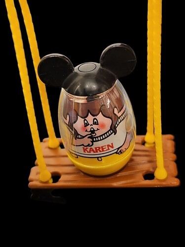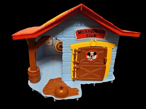 Description: It's the Mickey Mouse Clubhouse, just like the one on TV! This clubhouse is a fun-filled place for all Mouseketeers to gather and join the jamboree! Features include a swing, seesaw, grandstand, rocking chair, and flagpole with a "bumpy bucket ride". There's even a TV camera, light, and mail box with fan letters! The show sets up on a 16 x 16 inch paper play mat. The set included 4 Disney Weebles figures: Mickey Mouse, Pluto, Karen, and Billy.