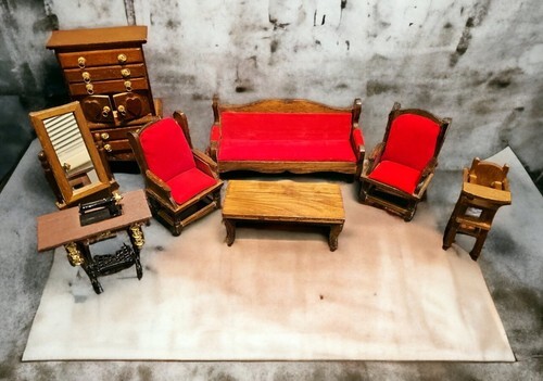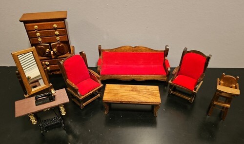This vintage Chadwick Miller dollhouse furniture set includes a burgundy sofa, high chair, sewing machine, chest of drawers, two arm chairs, and a mirror. Made of wood, this 8-piece lot is perfect for any room in your dollhouse. The scale is approximately 1:12, and the set is suitable for ages 16 and up.