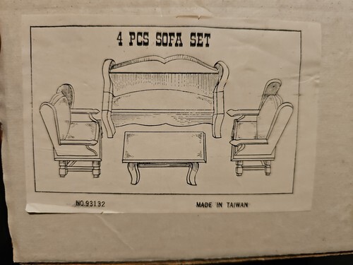 The set is an original and from Taiwan, with a theme of dollhouse furniture. It is suitable for collectors or those looking to decorate their dollhouse with a vintage touch.