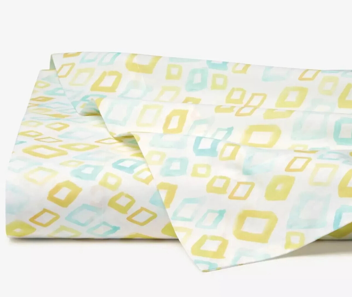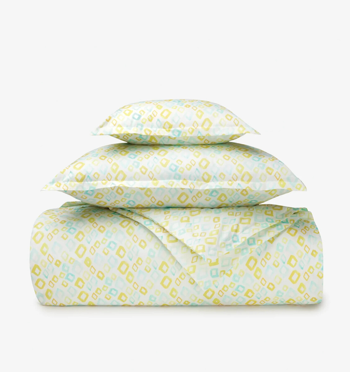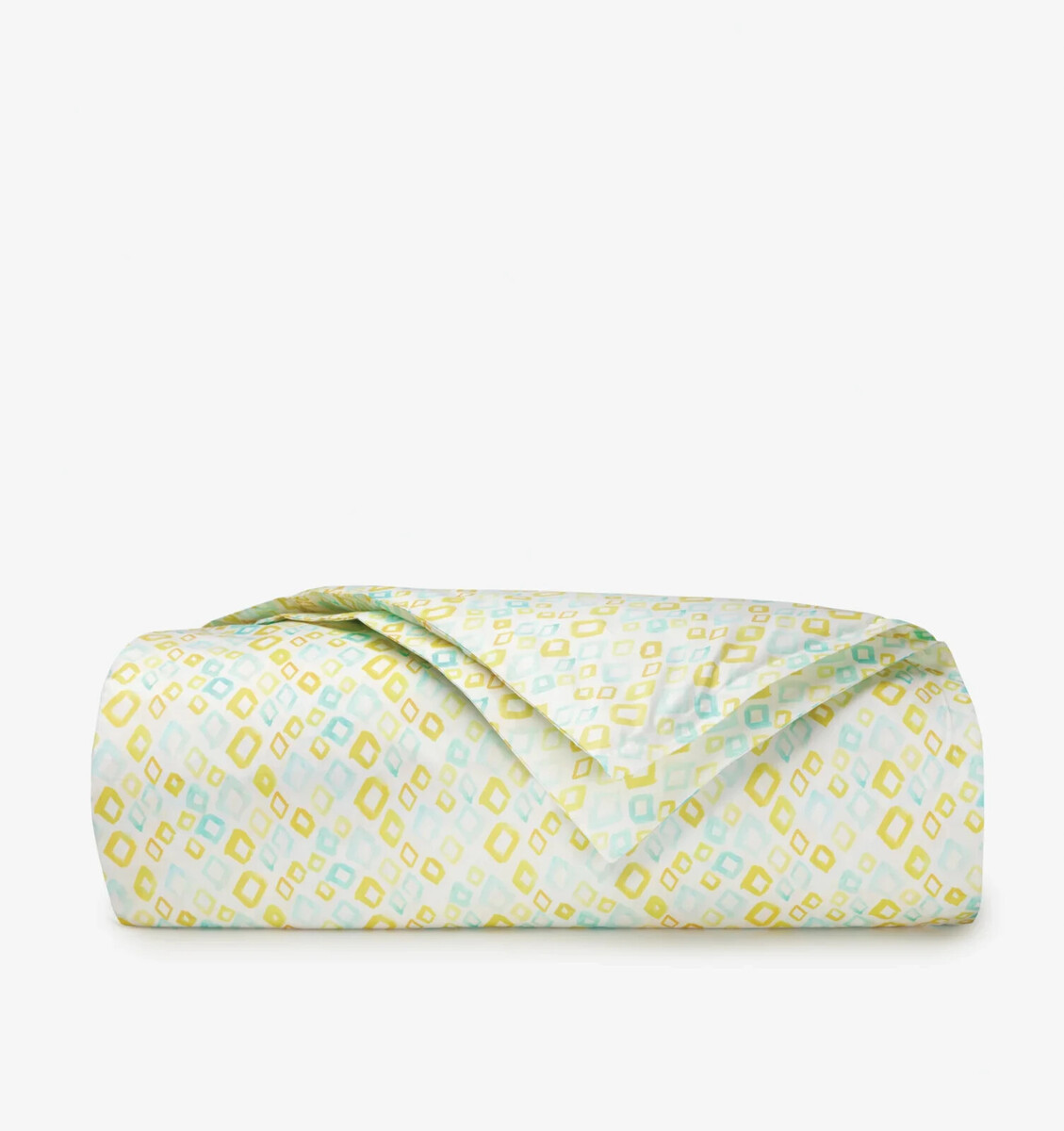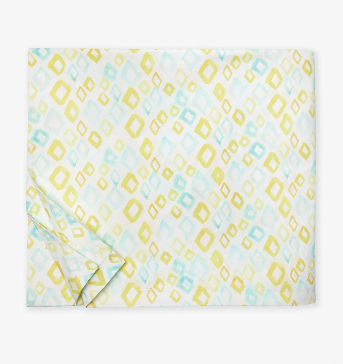 Whimsical and sophisticated in equal measure, the Geometrico collection is enlivened by yellow and aqua brushstrokes that form an all-over diamond pattern over a soft, white percale base.