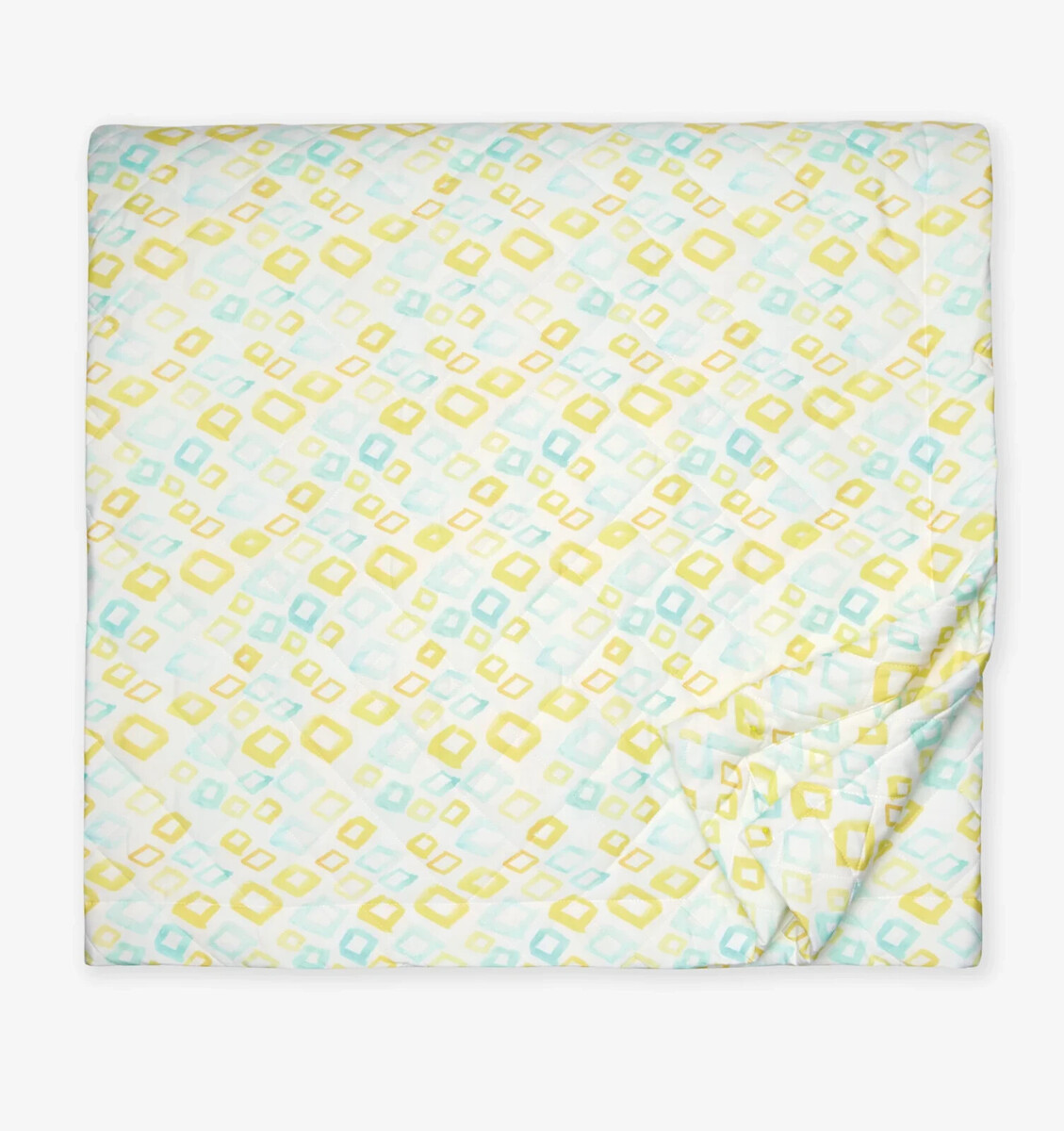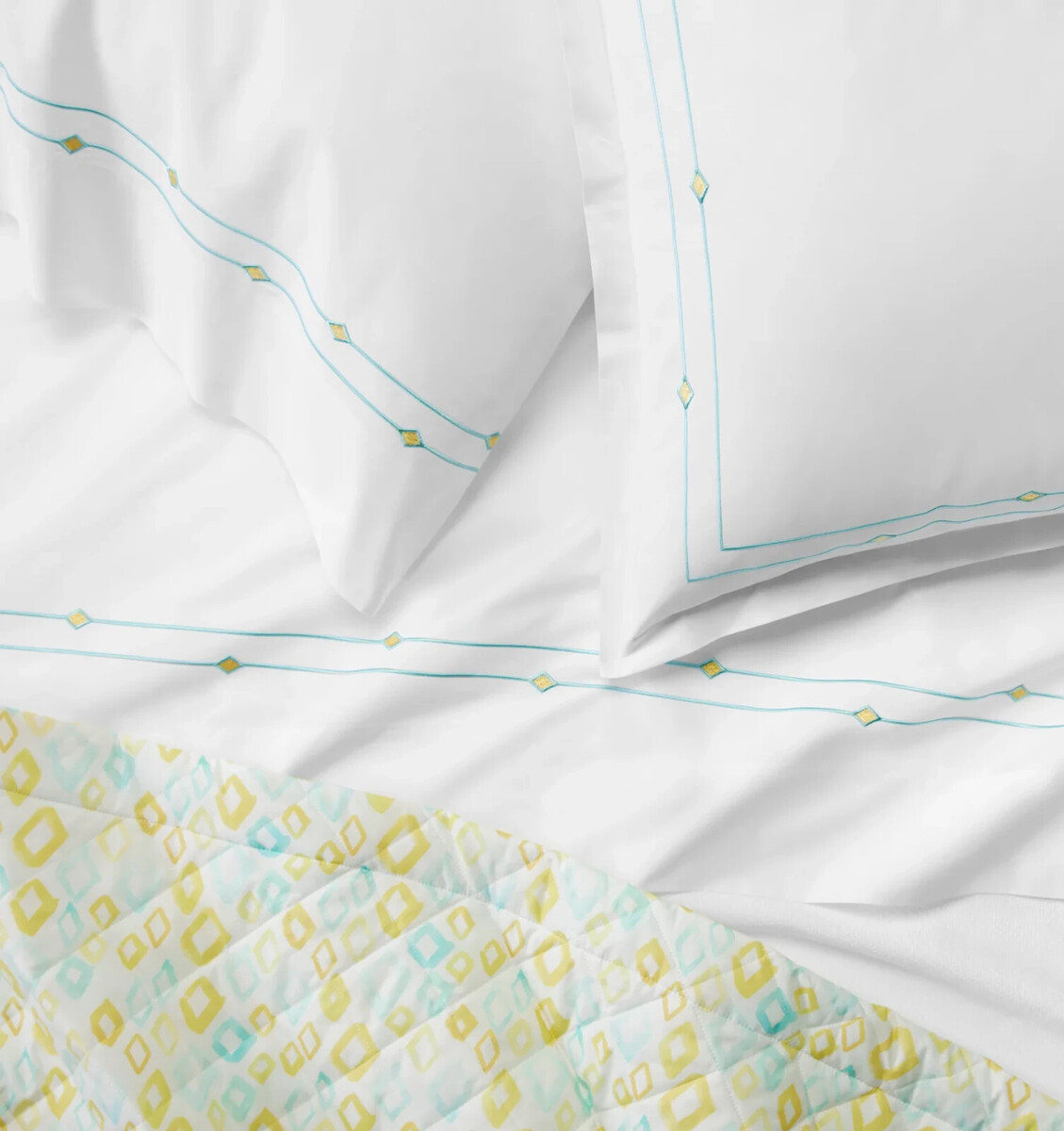 Whimsical and sophisticated in equal measure, the Geometrico collection is enlivened by yellow and aqua brushstrokes that form an all-over diamond pattern over a soft, white percale base.