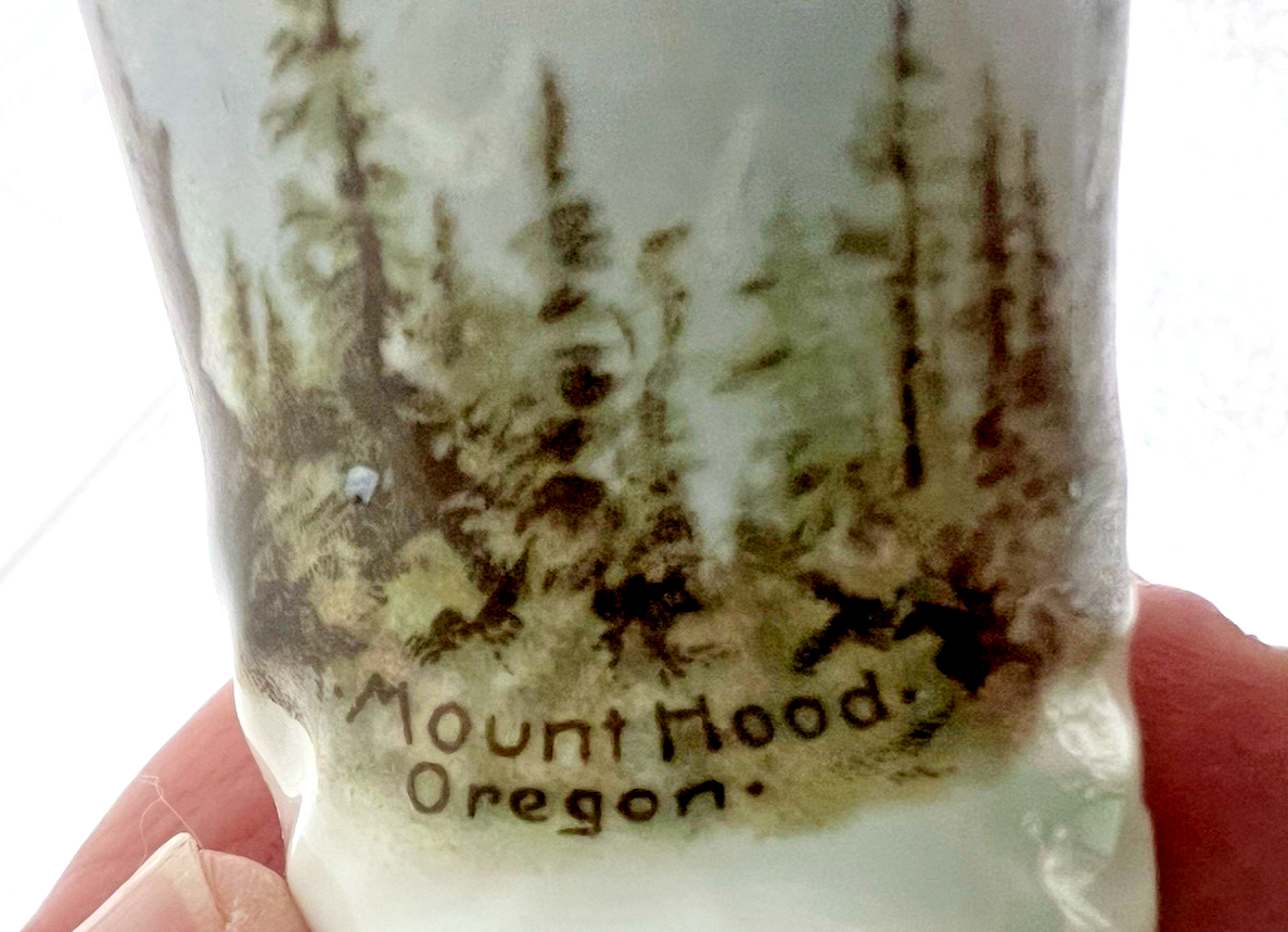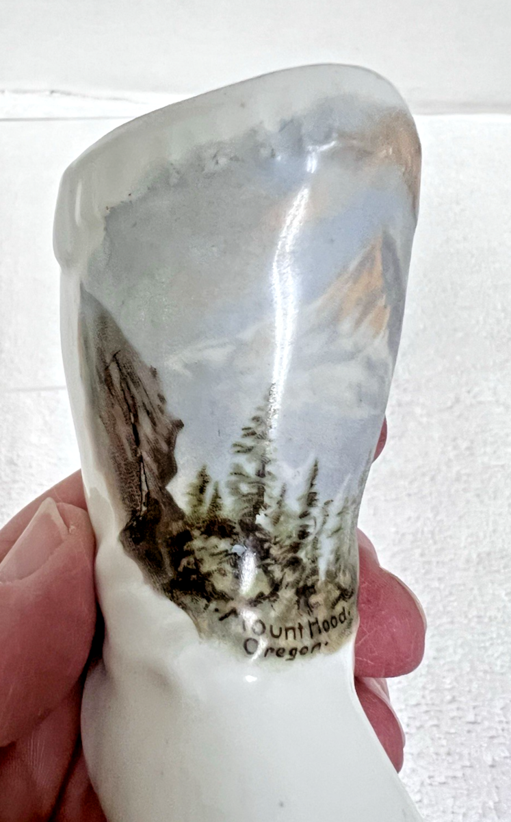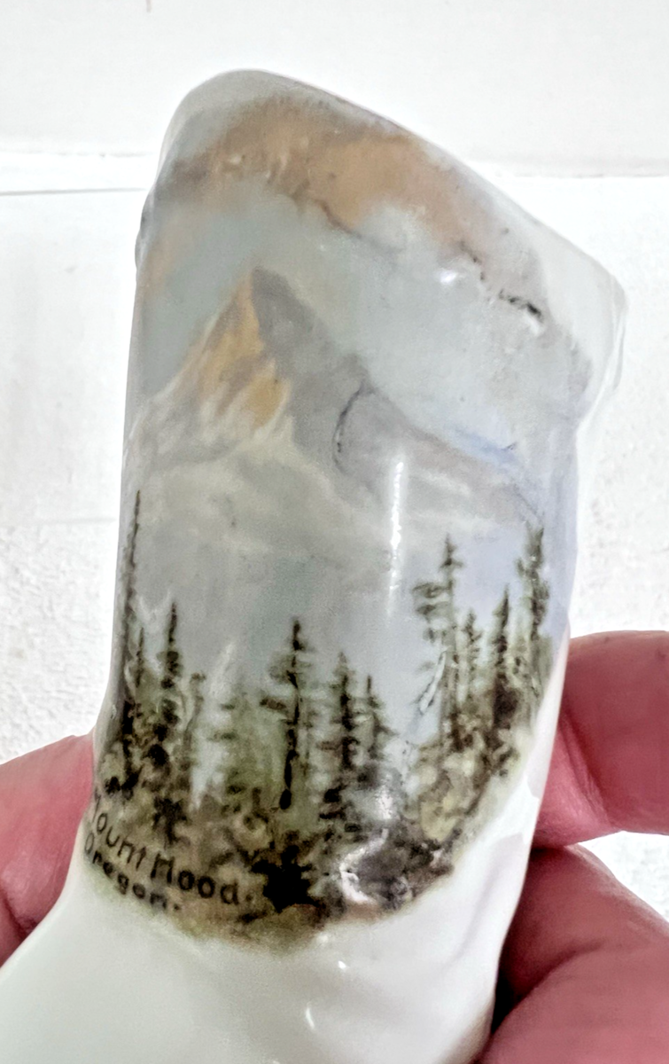Antique Early 1900's Mt Hood Oregon Souvenir Figural Porcelain Boot Germany. Painted scene of Mt Hood in the distance, trees, snow etc. on this approx 3 3/4" figural boot, made in Germany, very good condition, colors and lettering bright clear, no damage to porcelain boot. See pictures.