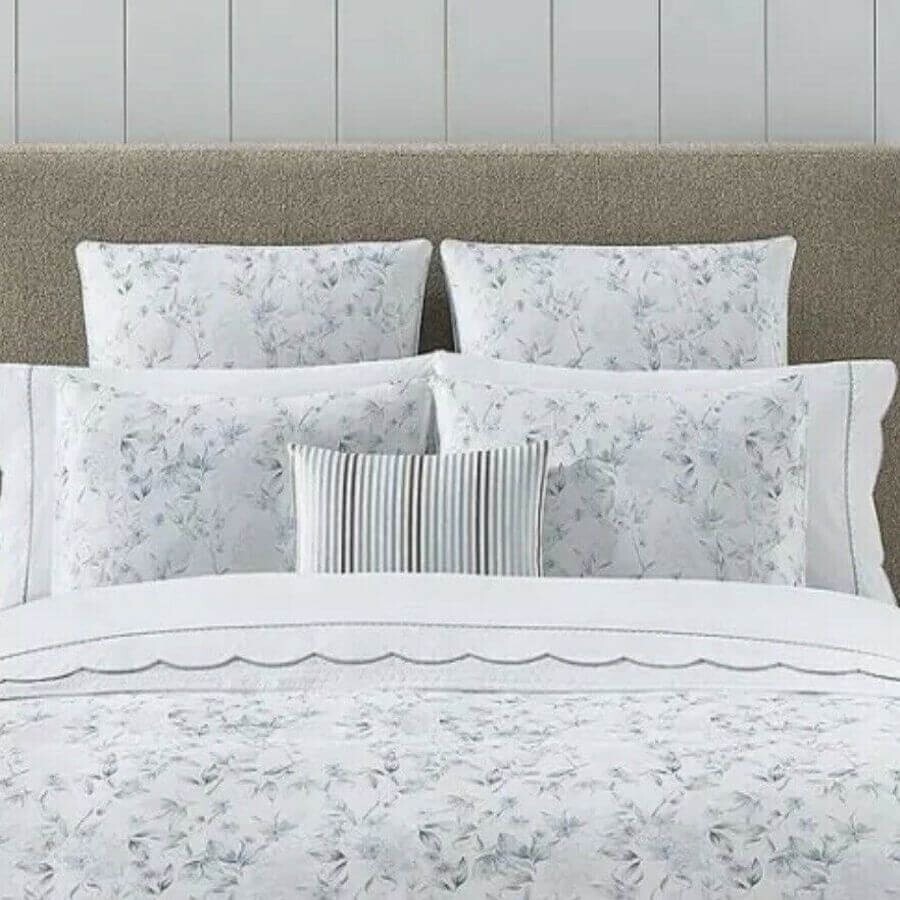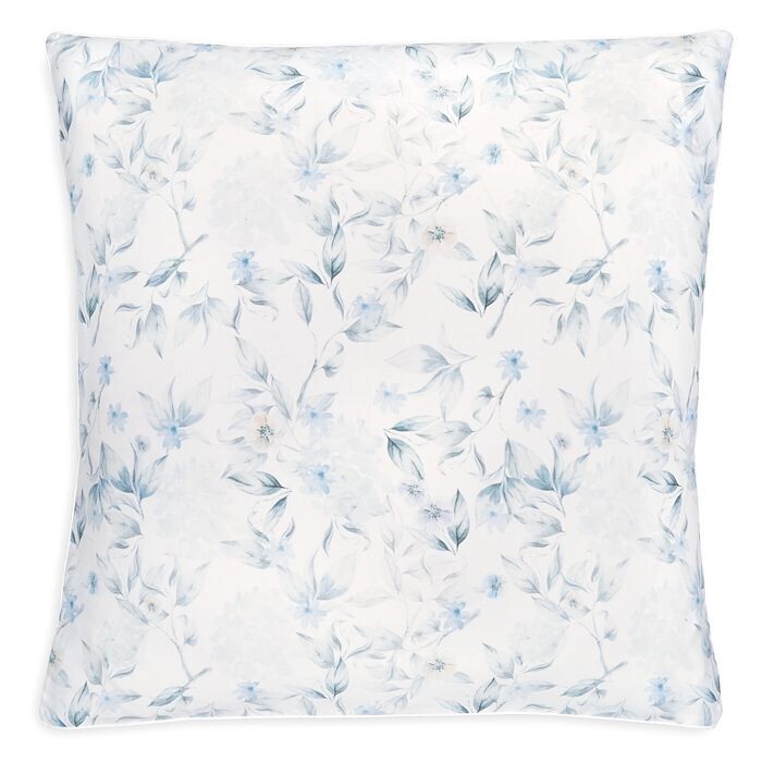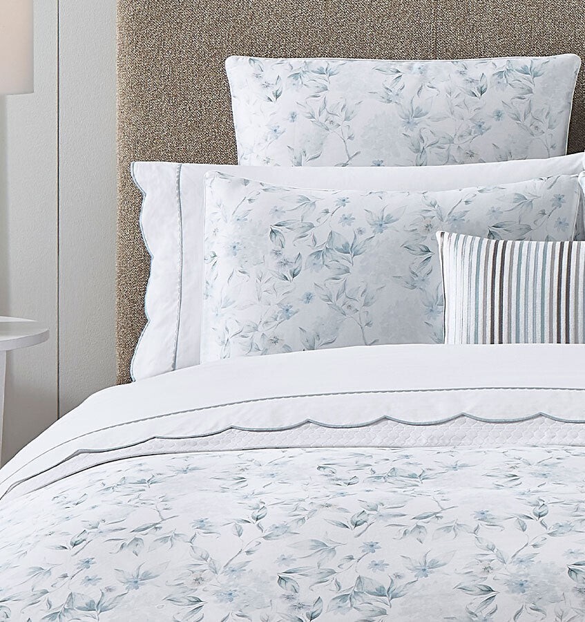 This sumptuous pure cotton sateen bedding features a watercolor-inspired floral in cool blues and grays, printed in Italy.