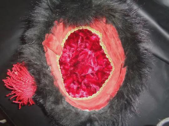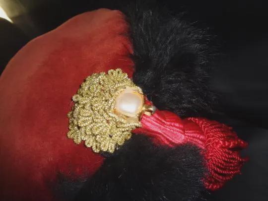 Wow! This 1980's vintage women's Fez hat has a lot going on! We know it's early 1980's because we acquired it, along with others, from a Theatrical Stage Opera company that was operational during that era (The San Jose Pacific Light House Opera Company). This Fez was meticulously hand-made for theatrical production and is a very high-quality creation. Please see our pictures.