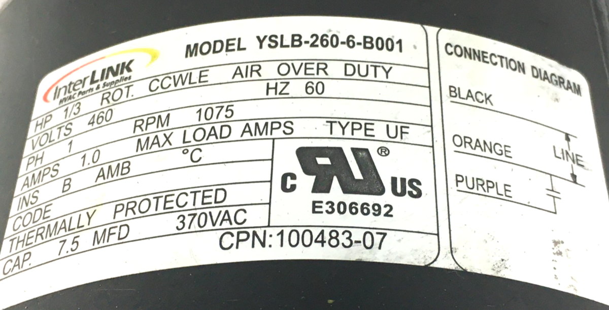 This is InterLink YSLB-260-6-B001 Condenser Motor Lennox 100483-07 1/3HP 460V 1075 RPM used part.