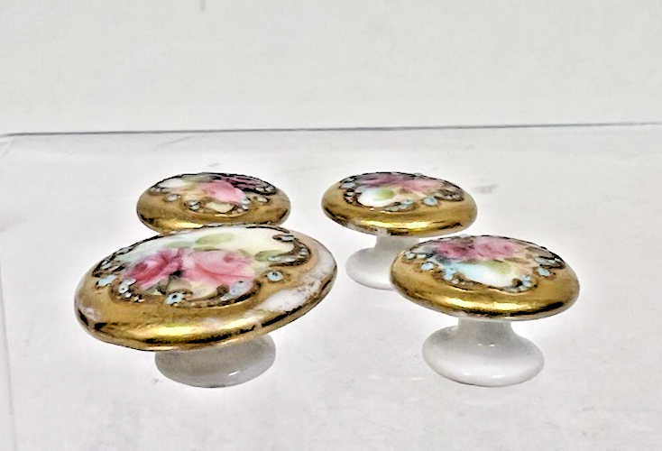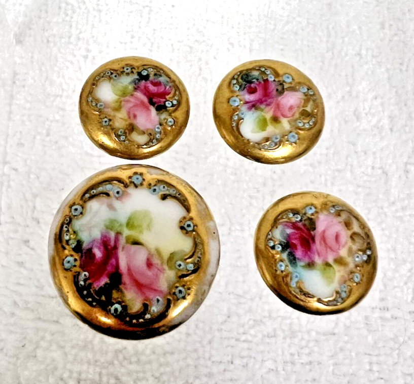 4 Antique Victorian Raised Relief Hand Painted Floral Porcelain Stud Buttons. 3 small round gold border accent flower floral porcelain stud buttons, measure approx. 5 /8" wide and 3/8" tall, no damage, gold raised relief and border accent in very good condition. 1 large round stud button measures approx. 7/8" wide and 3/8" tall, some wear to gold coloring, no damage. See pictures.