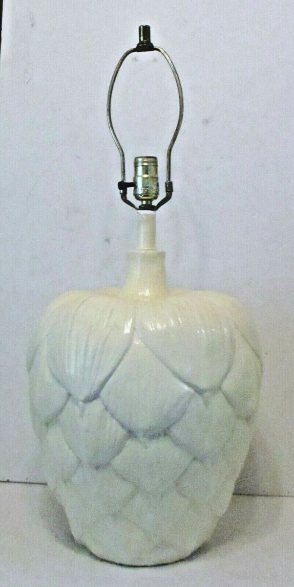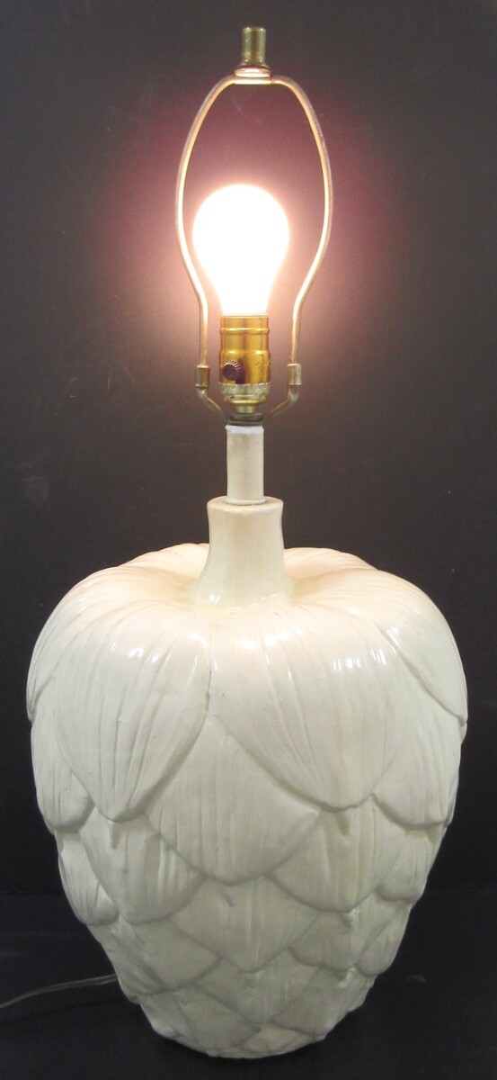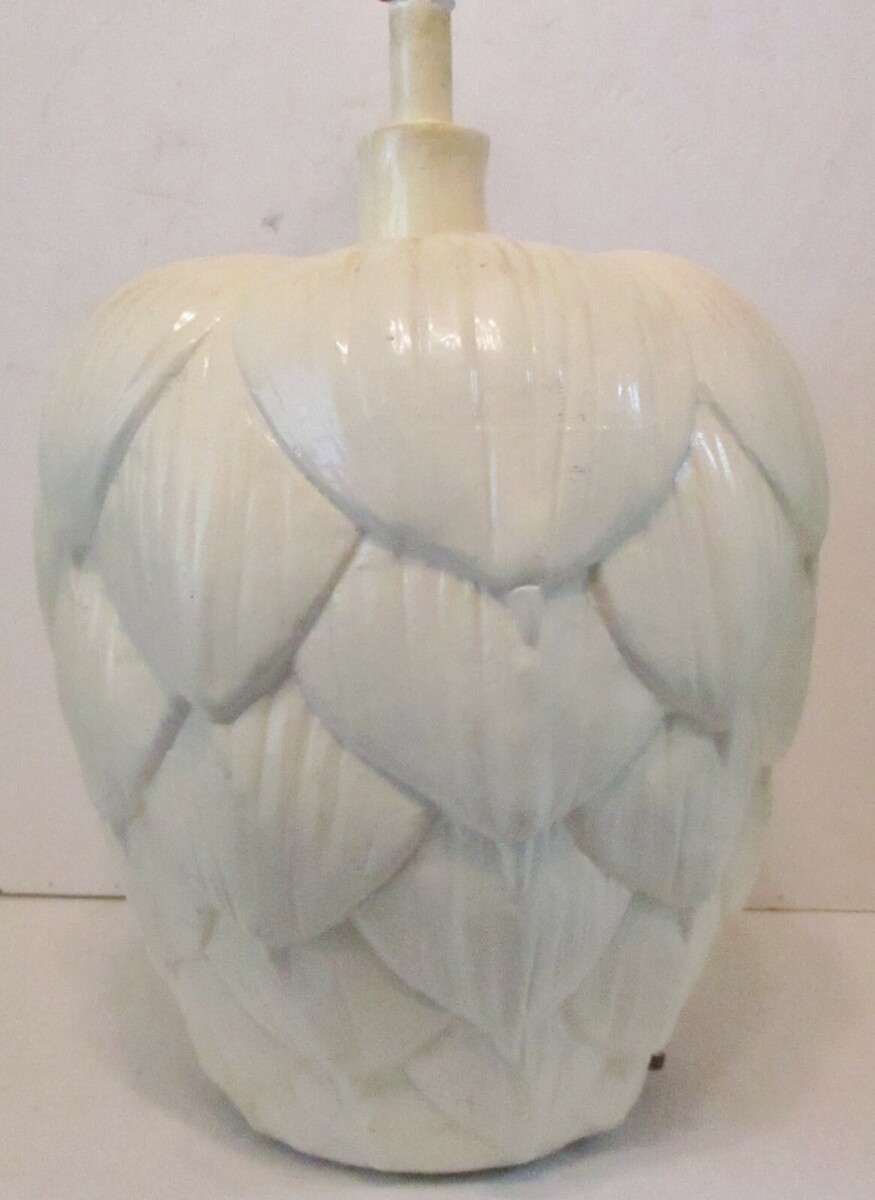 Mid-Century Modern sculptural white artichoke table lamp. This large ceramic lamp features a white painted finish and sculptural artichoke leaves. In the style of Chapman Lighting. There is not an included lampshade. The socket and switch have been newly replaced.