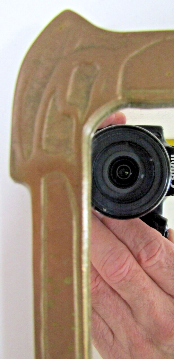Solid brass mirror with a beautiful young lady holding a tree for support as she looks at her reflection in the lake. The Lady of the Lake!