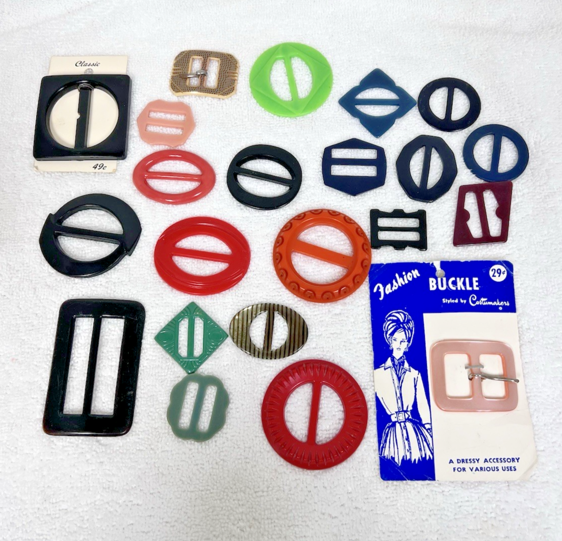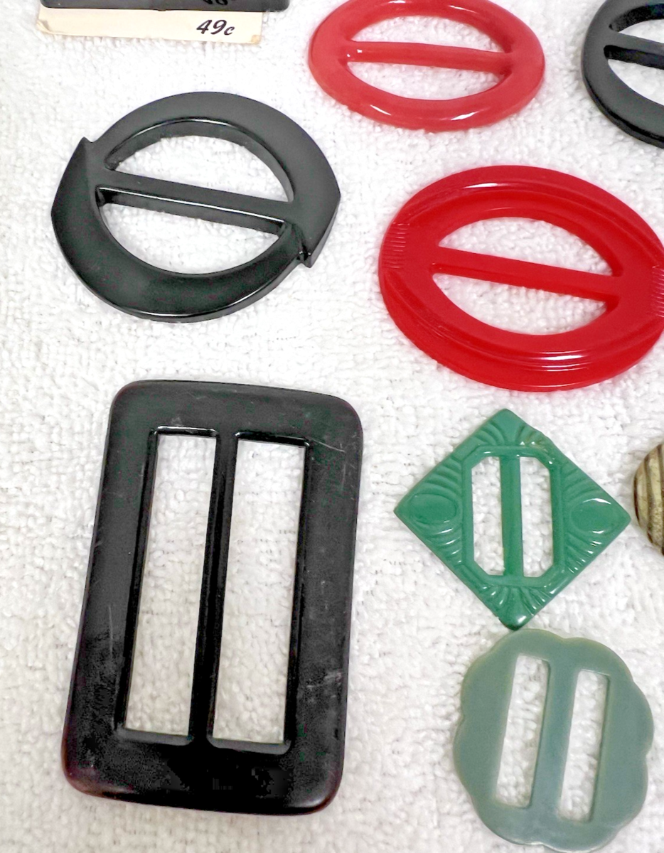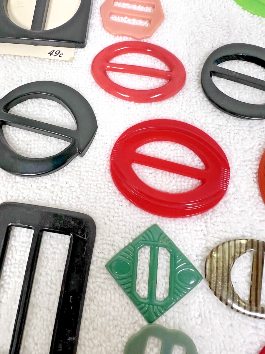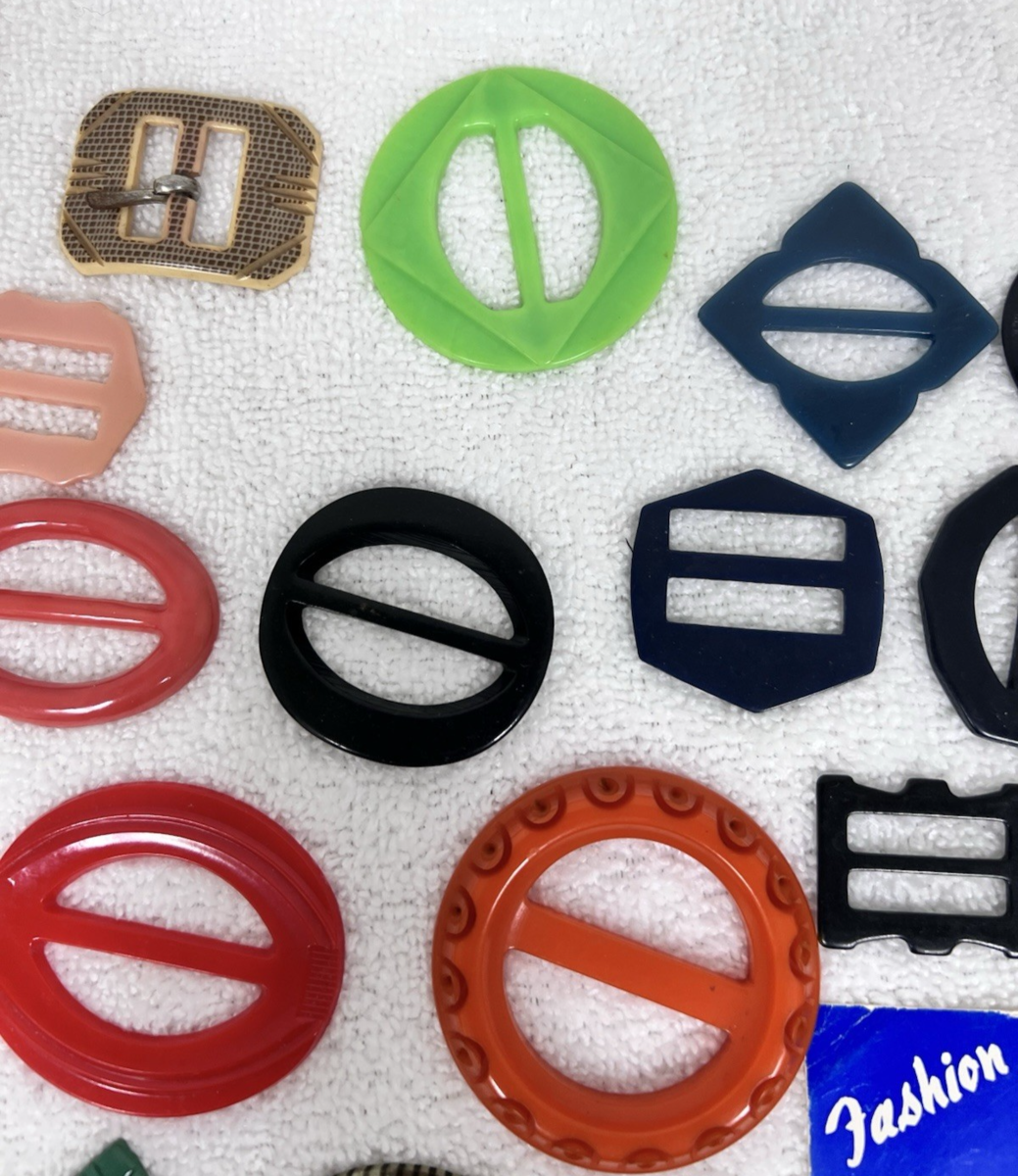 Lot 23 Antique Vintage Plastic Assortment Scarf Belt Buckles Red Green Blue. 23 buckles for belts, scarves, etc. all but one vintage old plastic some might be Bakelite, odd buckle is a pressed metal. The gamete of colors green, red, blue, orange, black...one attached to a Costume makers paper card and one to a Classic card 49 cent original price, no damage, small to large sizes. Very good condition, no cracks or damage. See pictures.