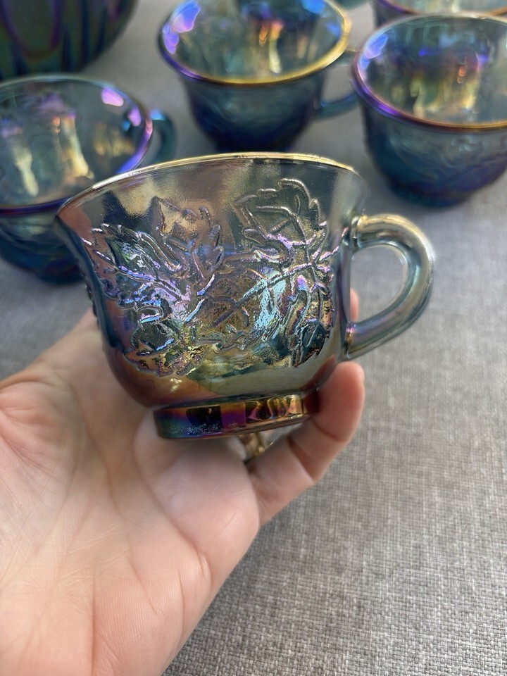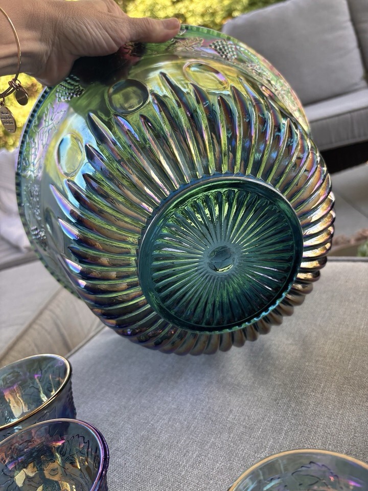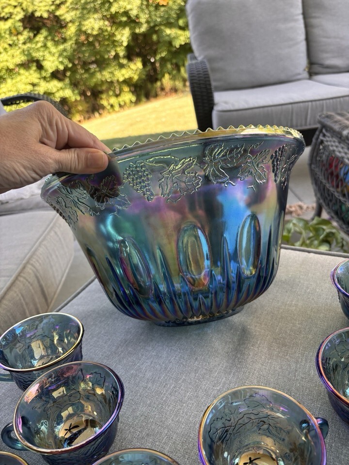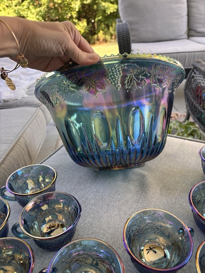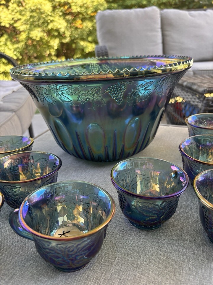 VINTAGE INDIANA GLASS IRIDESCENT BLUE HARVEST CARNIVAL GLASS PUNCH BOWL SET