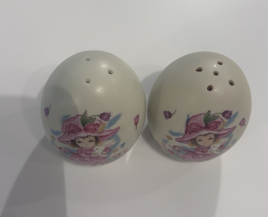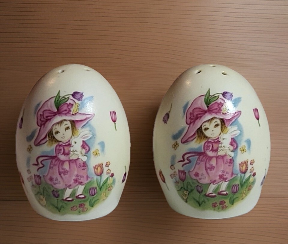 Vintage Lefton #8214 Egg Shape Salt & Pepper Shakers Easter Girl Bonnet w/Bunny