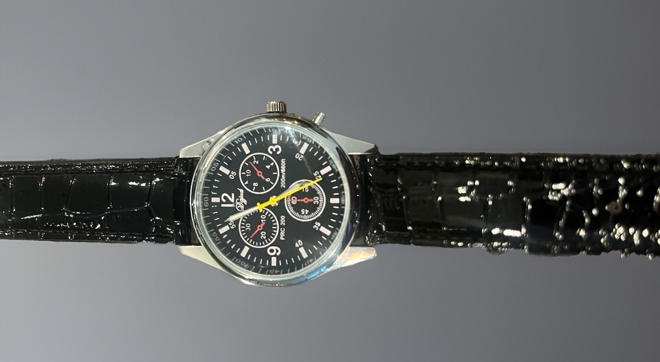 Really nice watch!!! SHARP!! This thing is nice!! Like new condition!! BRAND NEW BATTERY!! WORKS GREAT!!! The Dgjud Men's 10" Date Watch in black with a silver case features a two-piece faux leather strap with a buckle closure. The round watch shape has a 42mm case size with stick indexes and a 12-hour dial, perfect for both casual and formal wear. With a quartz movement and seconds hand, this classic and stylish wristwatch by Dgjud is a great addition to any man's collection.