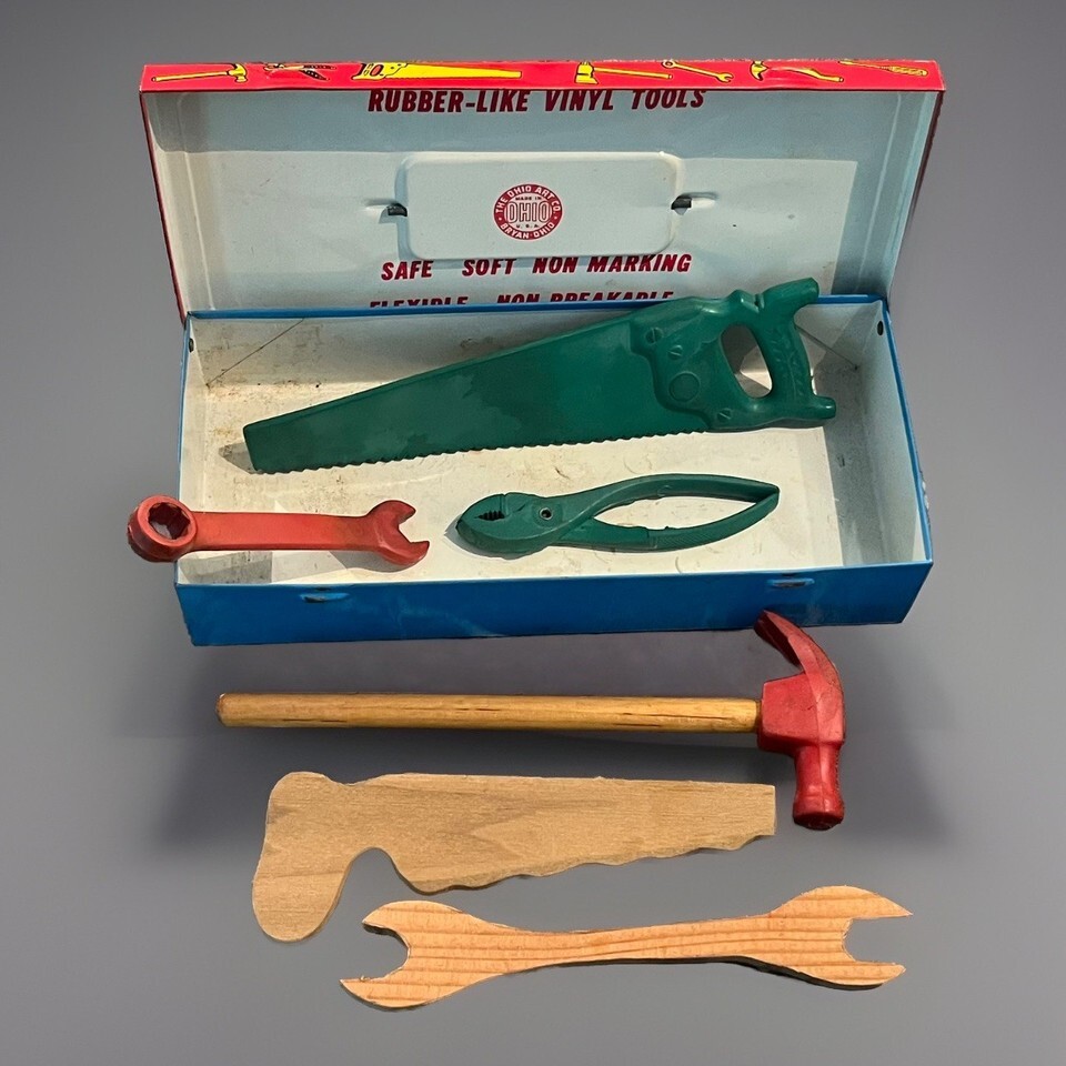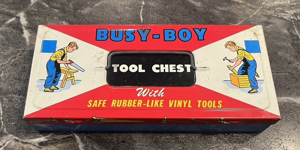 Vintage Busy-Boy Tool Chest Ohio Art Co. Tin Toy USA Rubber Vinyl Wood Metal