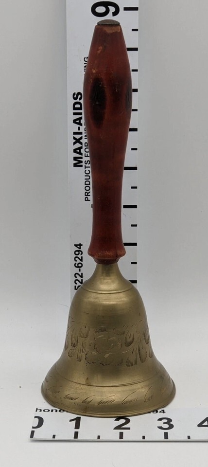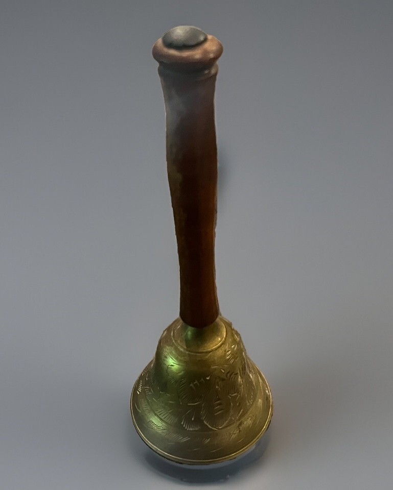 VTG Hand Held Brass w Wood Handle School Dinner Bell 9" India Signal Etched NICE