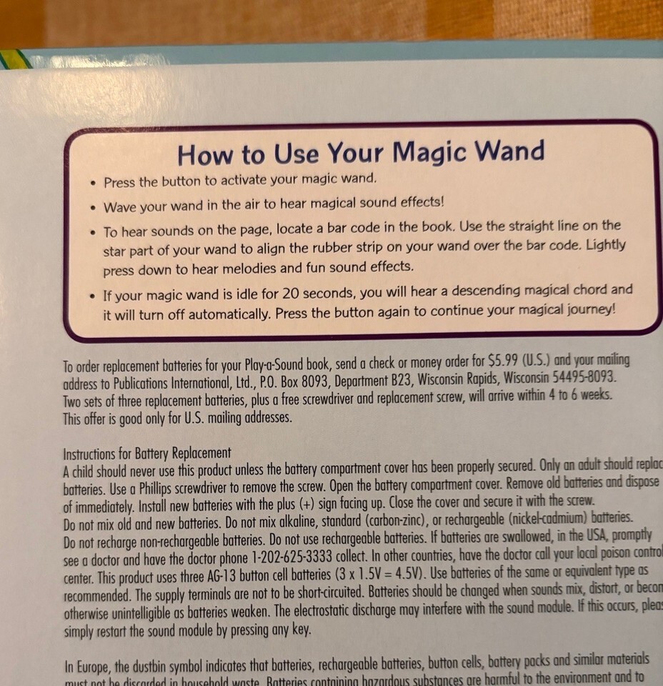 ? To hear sounds on the page, locate a bar code in the book. Use the straight line on the star part of your wand to align the rubber strip on your wand over the bar code. Lightly press down to hear melodies and fun sound effects.