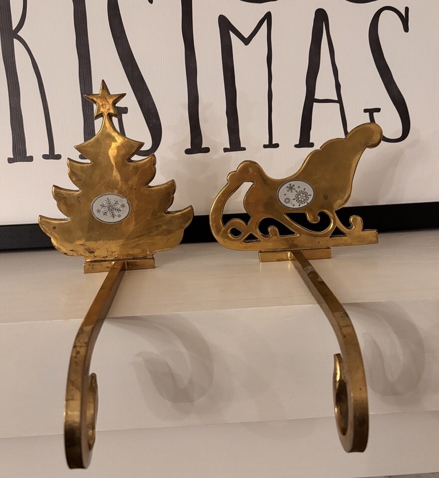 Vintage Brass Christmas Tree & Sleigh Christmas Stocking Holder Hook Long Arm