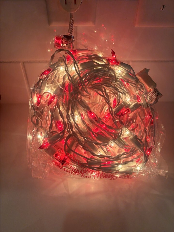 New Old Stock. Red and White lights. White Cord. 11 ft total. Box is a little beat up.