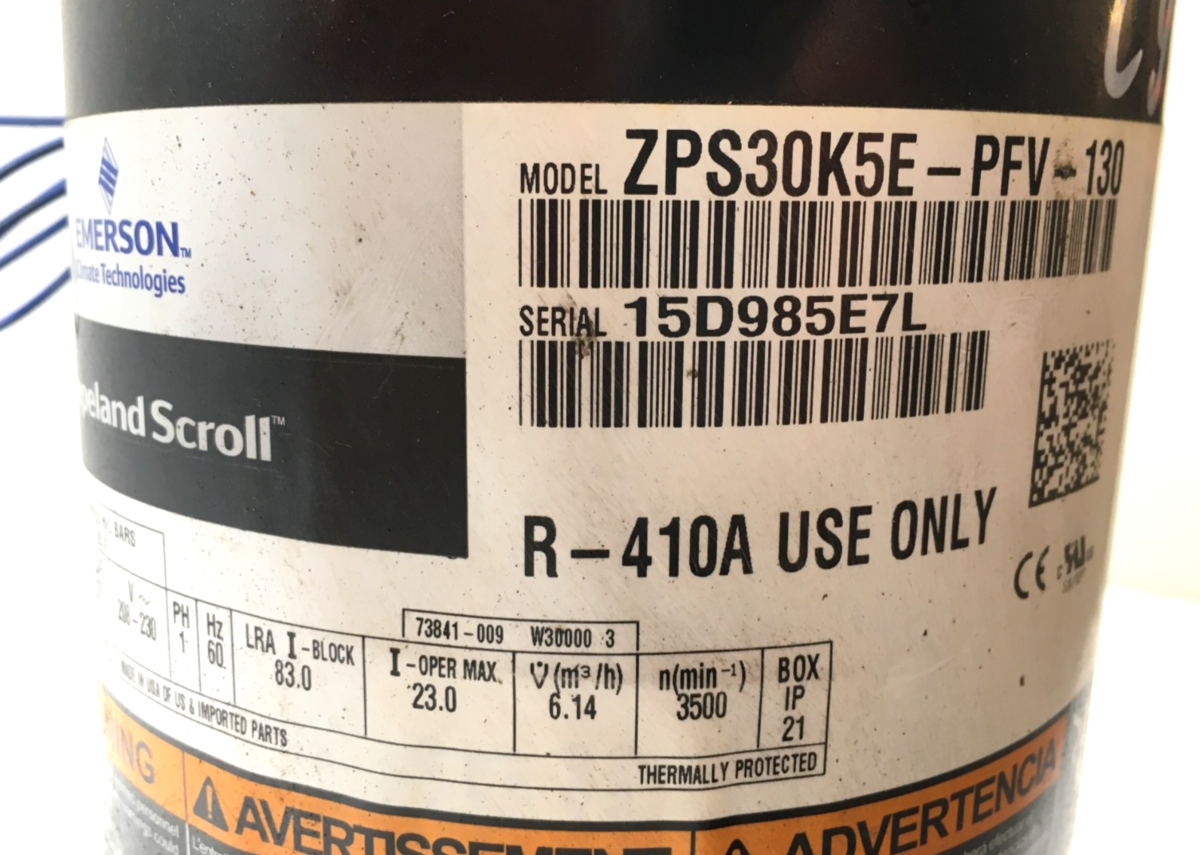This is COPELAND Scroll Compressor ZPS30K5E-PFV-130 2 stage 230V 1PH 60HZ R-410A only! used part.