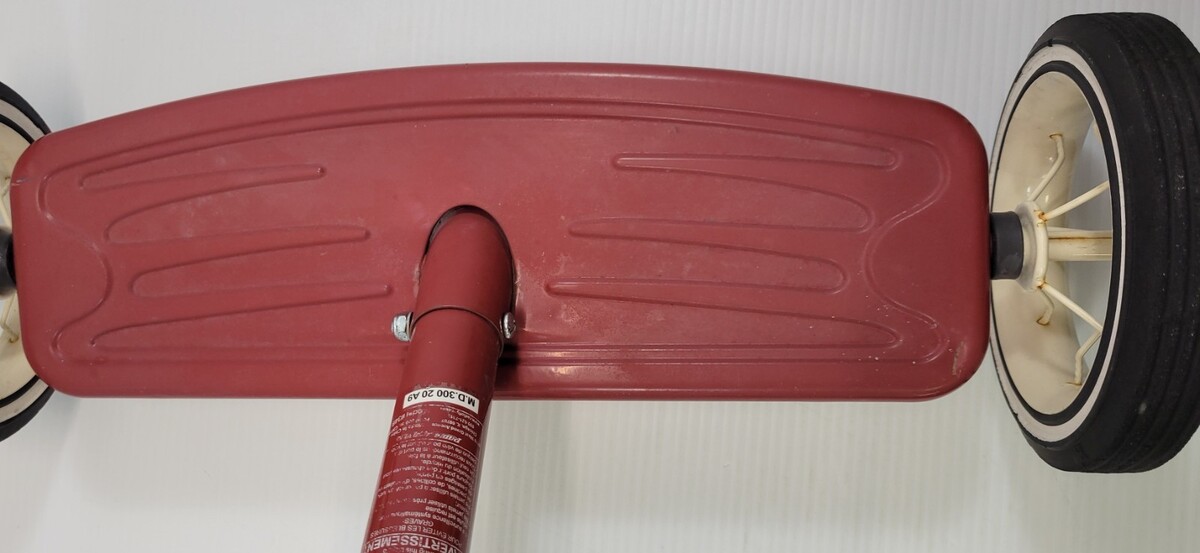 Tricycle shows signs of age and outdoor storage including some surface rust spots, tarnish and sun fading to plastic and painted parts. There are NO handle grips. Tricycle is functionable as-is with no handle grips or a good candidate for restoration.