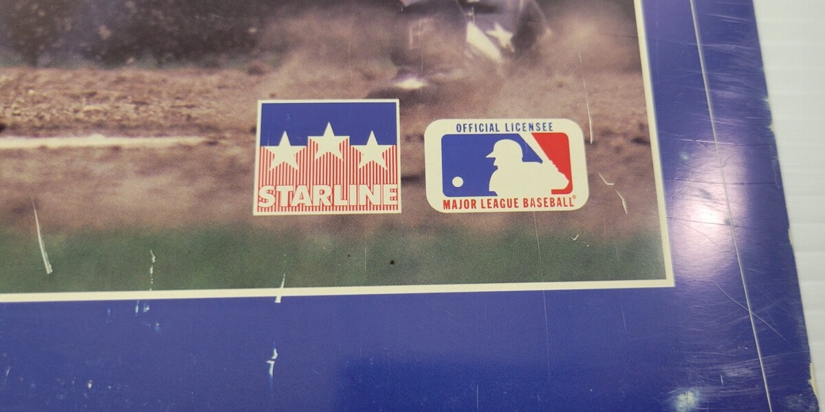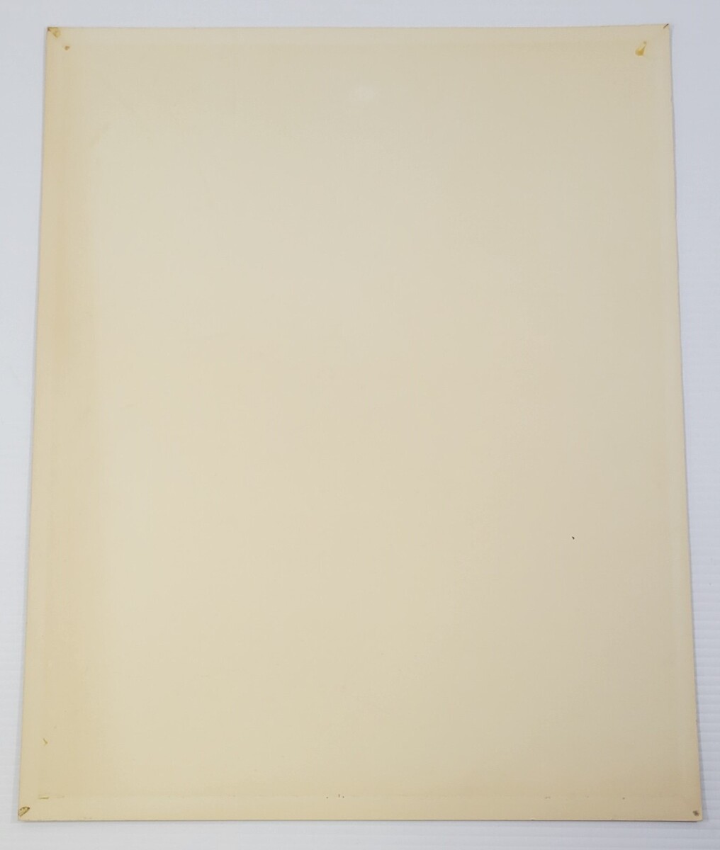 Poster has signs of age and years of storage including scuffs, scratches and marks to the finish, specifically down the right side of the poster. Poster has never been tacked, taped or rolled but has some adhesive residue on the back. Semi-rigid poster will be shipped flat.