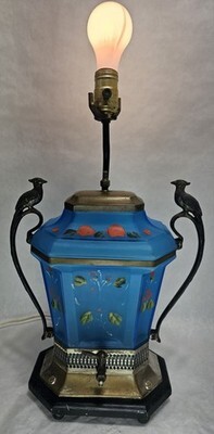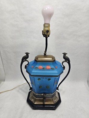 Antique Blue Satin Glass Samovar converted to a Lamp Peacock The glass has handpainted flowers. Some flowers on the body of the piece have worn off. See photos for condition of silver plate.