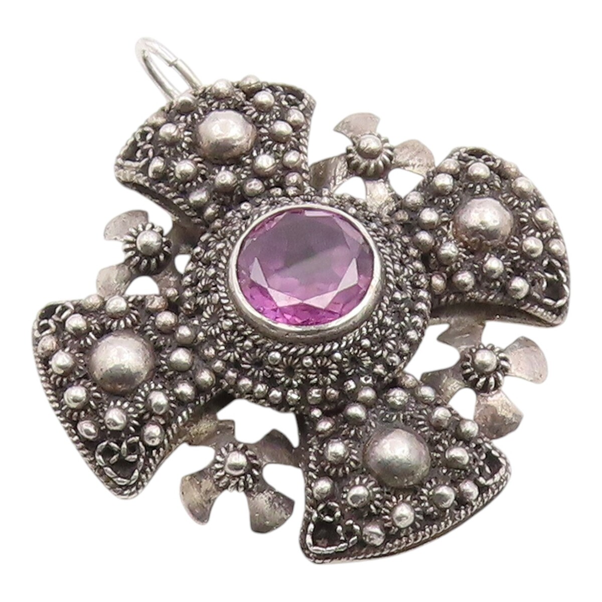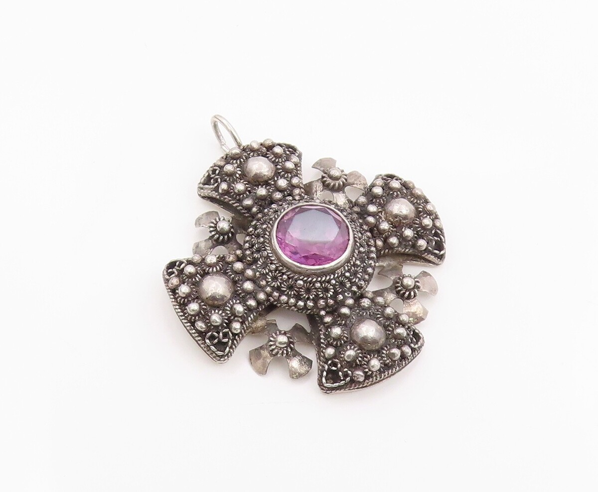 925 Sterling Silver Vintage Pendant JERUSALEM Amethyst Maltese Cross PT26047