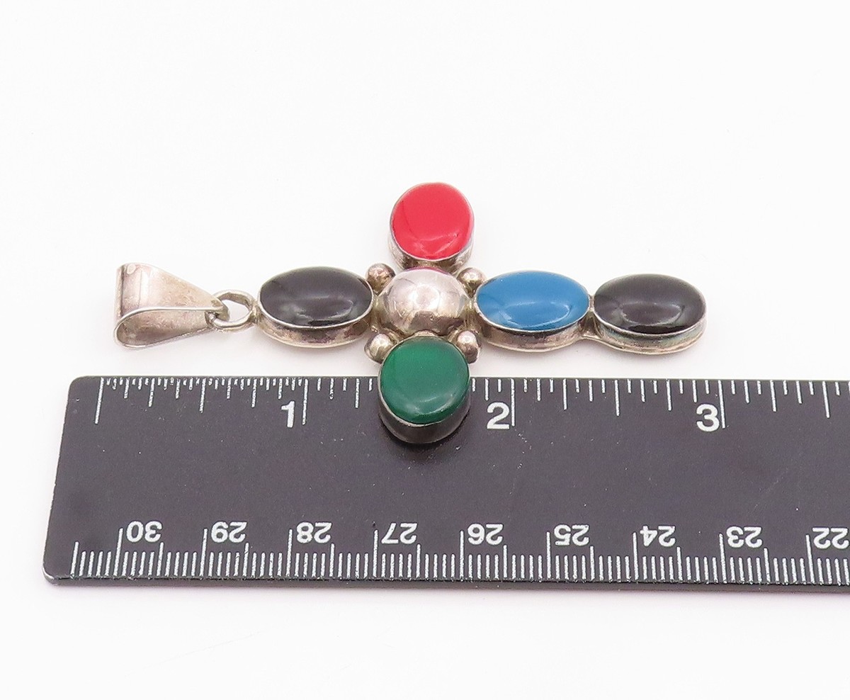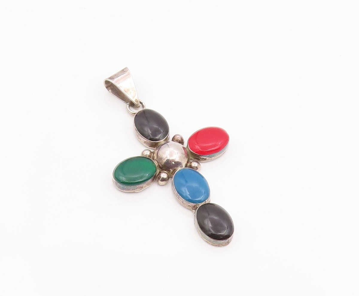 925 Sterling Silver Vintage Pendant MEXICO Cabochon Multi Gemstone Cross PT26045