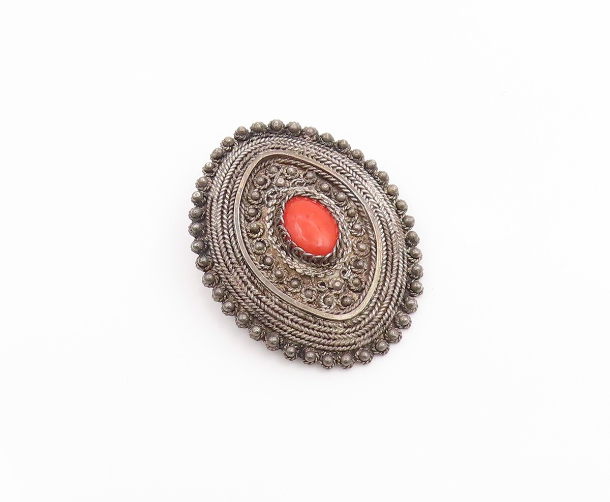 925 Sterling Silver Vintage Brooch ISRAEL Cabochon Coral Statement Pin BP12440