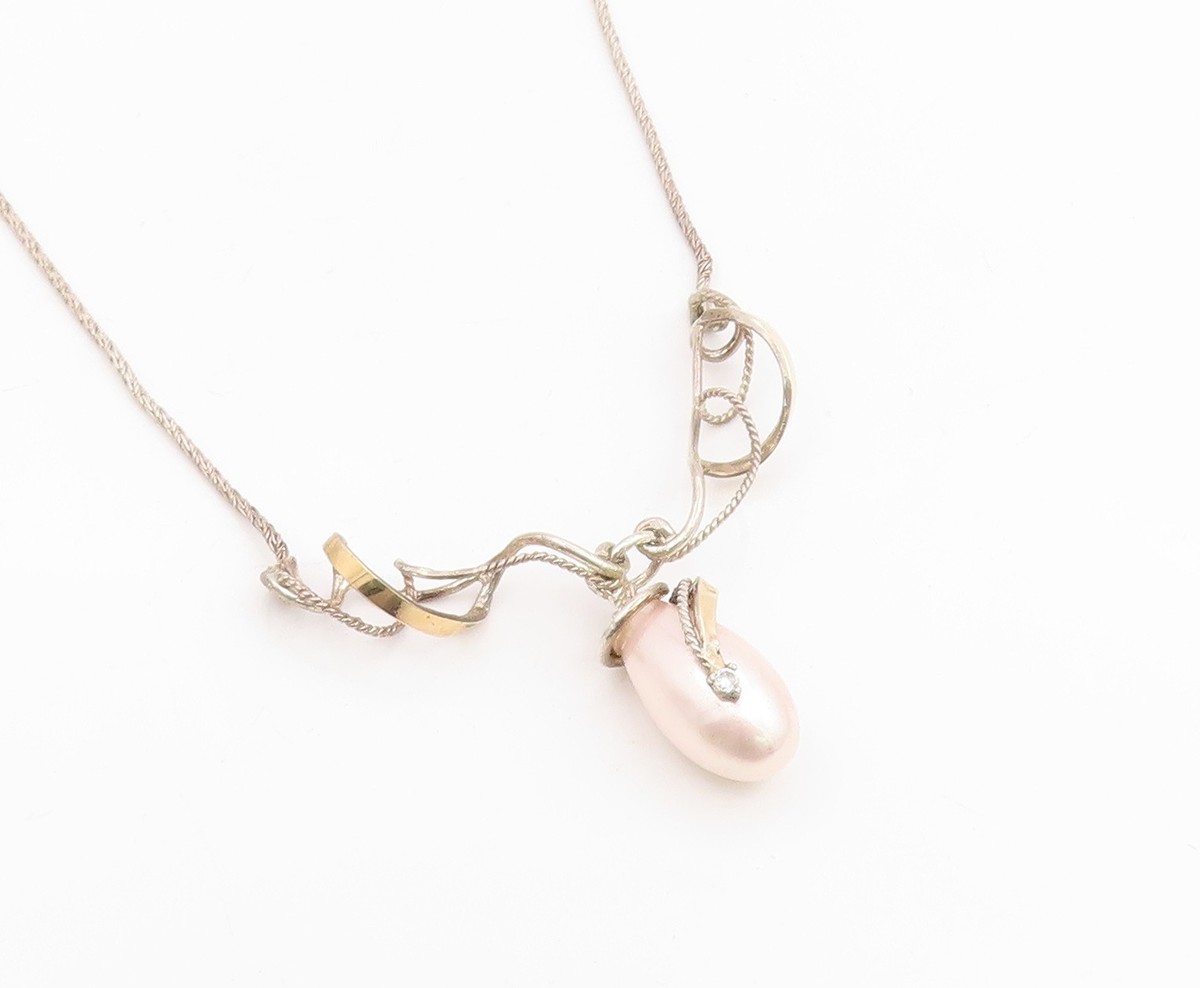 14k Gold & 925 Sterling Silver Vintage Necklace Elegant Pearl & CZ Drop NE4861