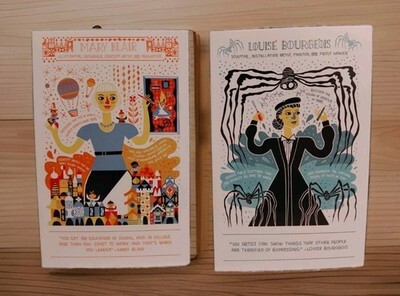 The postcards feature artwork of various notable women and showcase different characters and subjects related to women in arts, science, history, and fashion design.