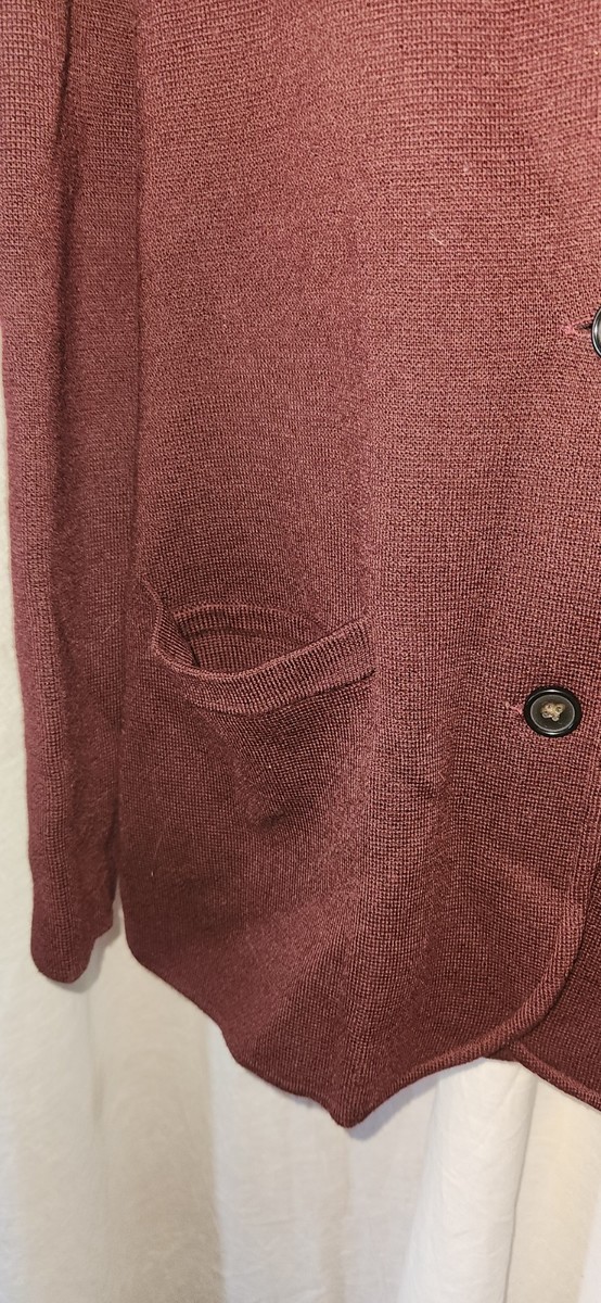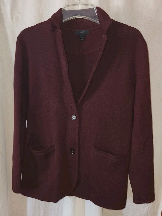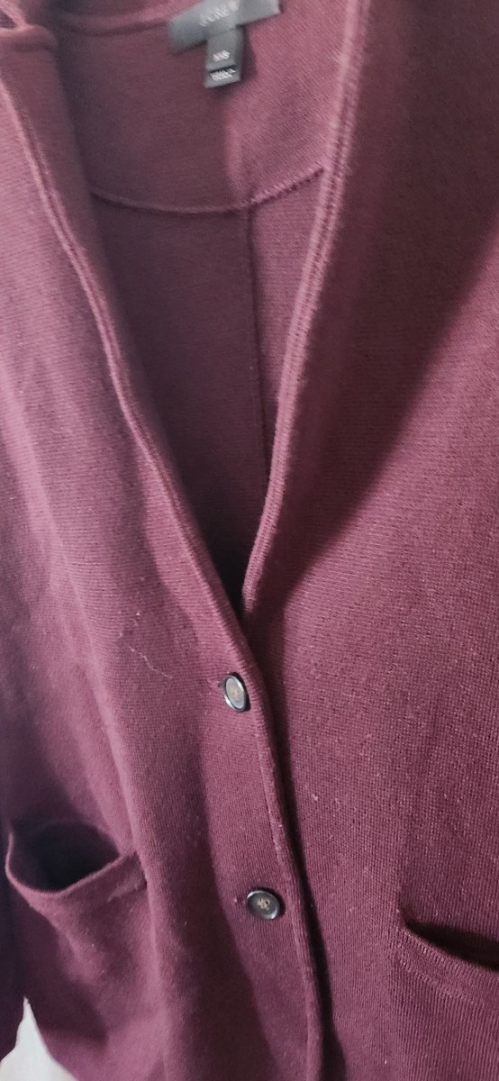 Nice condition J Crew XXS 2 button cardigan. Some wear at the pocket. 19 inches pit to pit. Shoulder to bottom is 24 inches. Dark Maroon color. 2 front pockets