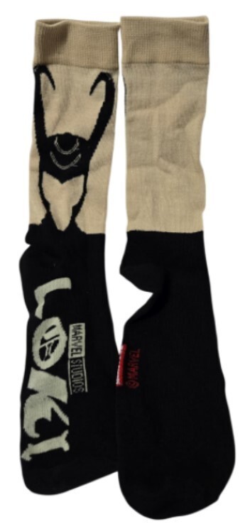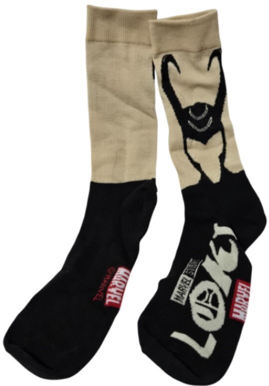 Socks: The crew socks feature the distinctive horned helmet logo of the character Loki in black and beige. They are made from a polyester and spandex blend for comfort and stretch.