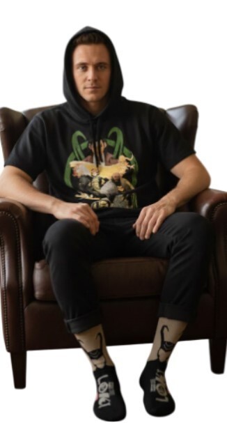 This is Marvel Loki apparel bundle featuring a short-sleeve hoodie and a pair of crew socks. The items feature graphics related to the Disney+ series, specifically characters from the show like Mobius, Classic Loki, and Alligator Loki, alongside the main character