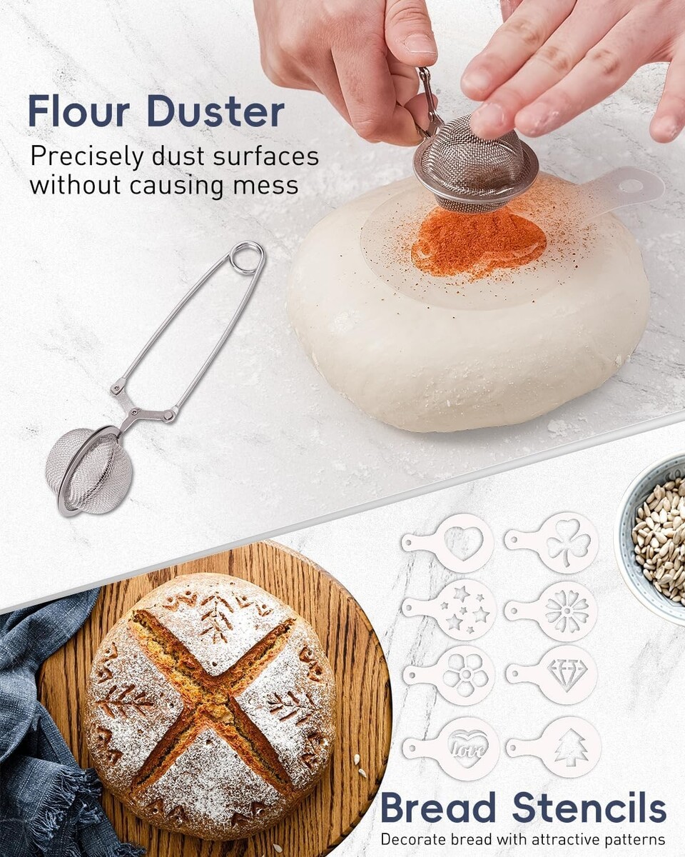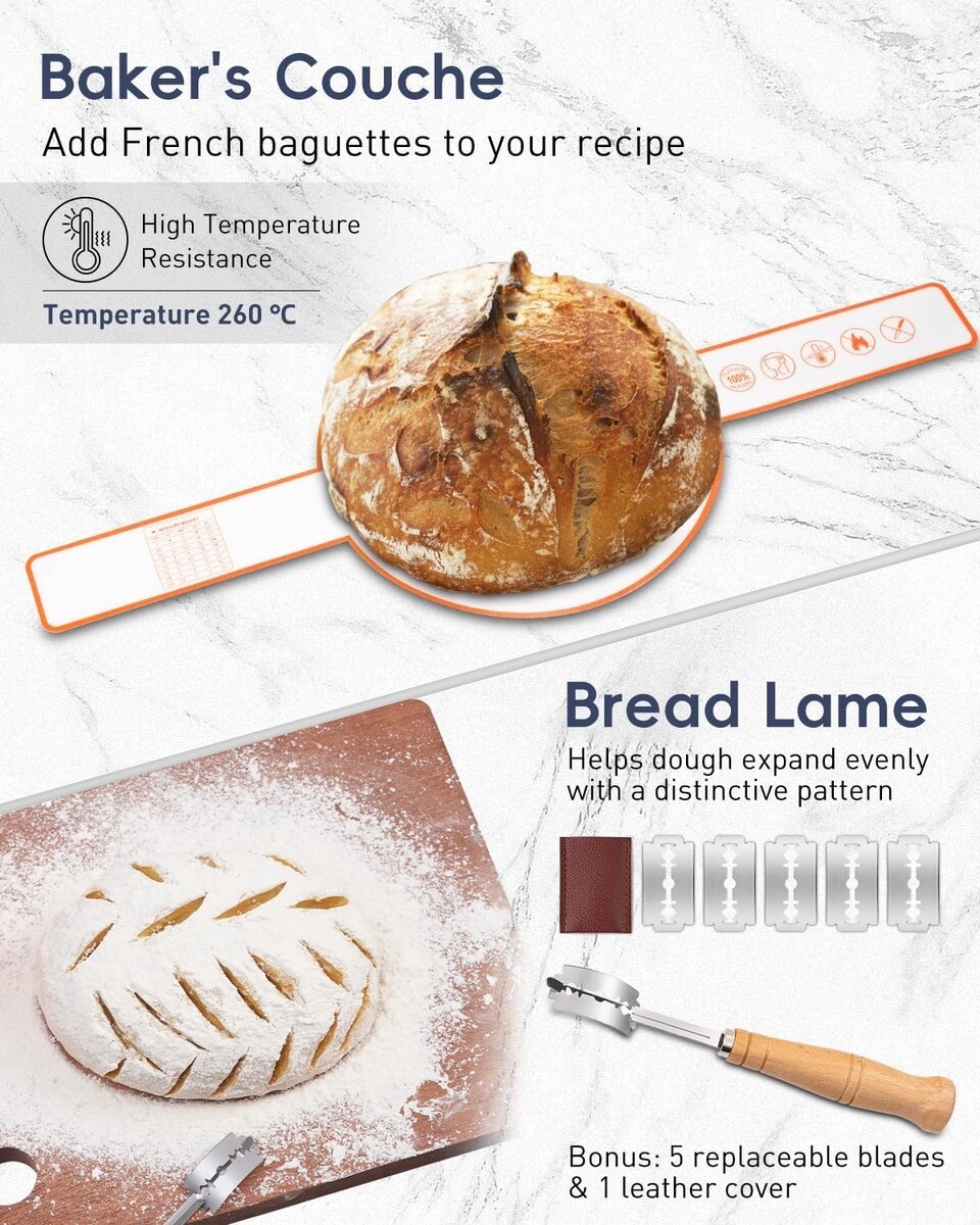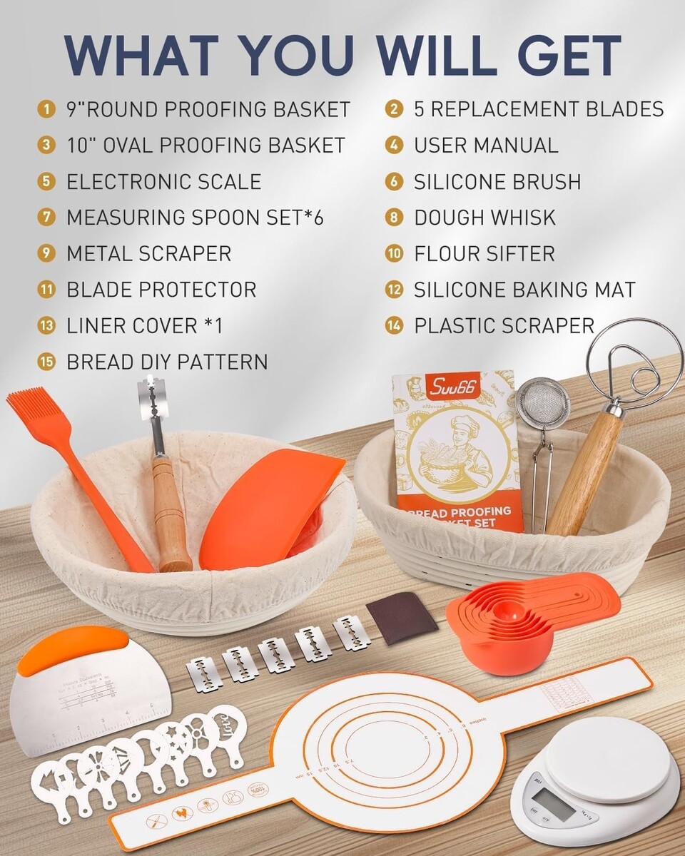 Complete Bread Making Kit: Our extensive package includes a 9-inch round proofing basket, a 10-inch oval proofing basket, two liner covers, user manual, dough whisk, blade protector, five replacement blades, bread lame, electronic scale, silicone baking mat, metal and plastic scales, silicone brush, flour sifter, a set of six measuring spoons, and a set of eight bread DIY patterns.