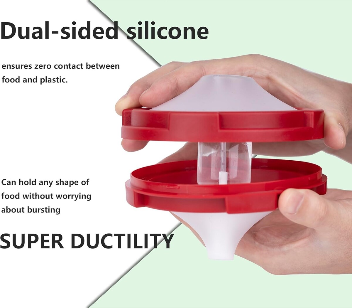 Dually-sided silicone design ensures zero contact between food and plastic, preventing oxidation.