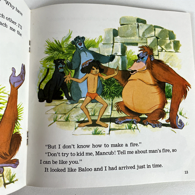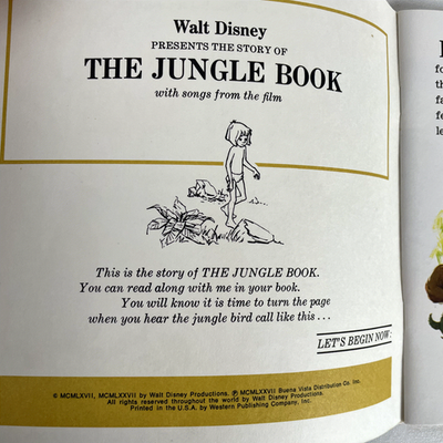Step into the enchanting world of Walt Disney's The Jungle Book with this vintage 7-inch read-along record. Released in 1977 by Disneyland Records, this unique offering combines a full-color, 24-page storybook with a 33? RPM vinyl record, designed to bring the beloved tale of Mowgli, Baloo, Bagheera, and King Louie to life. This special edition allows young readers to "See the pictures, Hear the record, Read the book," making for an immersive storytelling experience that has captivated generations.