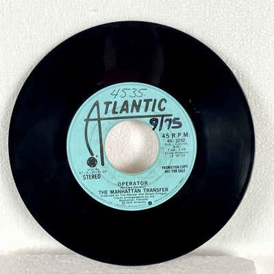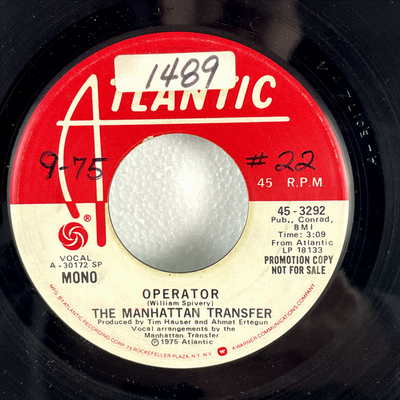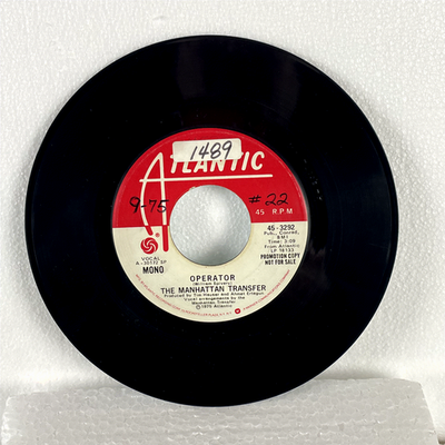 Discover a piece of music history with this rare 1975 Atlantic Records 7-inch promotional single by The Manhattan Transfer, featuring their iconic track "Operator." This collectible promo copy, clearly marked "PROMOTION COPY NOT FOR SALE," presents a unique offering for fans and collectors. The single features a mono version of "Operator" on the red Atlantic label (catalog A-30172 SP) and a stereo version on the light blue Atlantic label (catalog A-30177 SP), both spinning at 45 RPM.