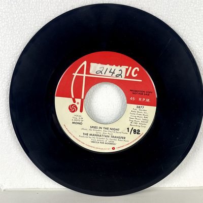 Discover this rare promotional 7-inch vinyl single featuring The Manhattan Transfer's captivating track, "Spies in the Night." This collectible record, released by Atlantic in 1981, is a direct-from-the-label promotional copy, explicitly marked "PROMOTION COPY NOT FOR SALE," making it a unique find for collectors and fans. The A-side presents the vibrant vocal stereo version of "Spies in the Night" running 3:59, while the B-side offers a distinct mono mix of the same track, also 3:59, providing a different sonic experience. Both versions are sourced from their acclaimed album, "Mecca For Moderns" (Atlantic LP 16036).