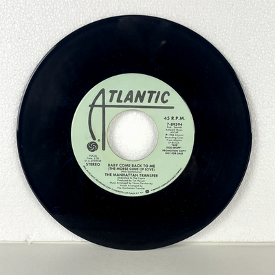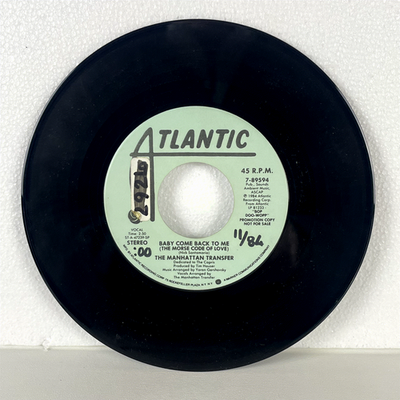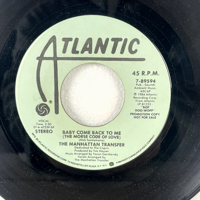 Discover this rare 1984 Atlantic Records 7-inch single of "Baby Come Back To Me (The Morse Code Of Love)" by the acclaimed vocal group, The Manhattan Transfer. This particular pressing is a highly sought-after PROMOTION COPY, clearly marked "NOT FOR SALE," making it a unique collectible for fans and vinyl enthusiasts. The track, known for its Doo-Wop influences and intricate vocal arrangements, showcases the group's signature style that blends jazz, pop, and R B elements.