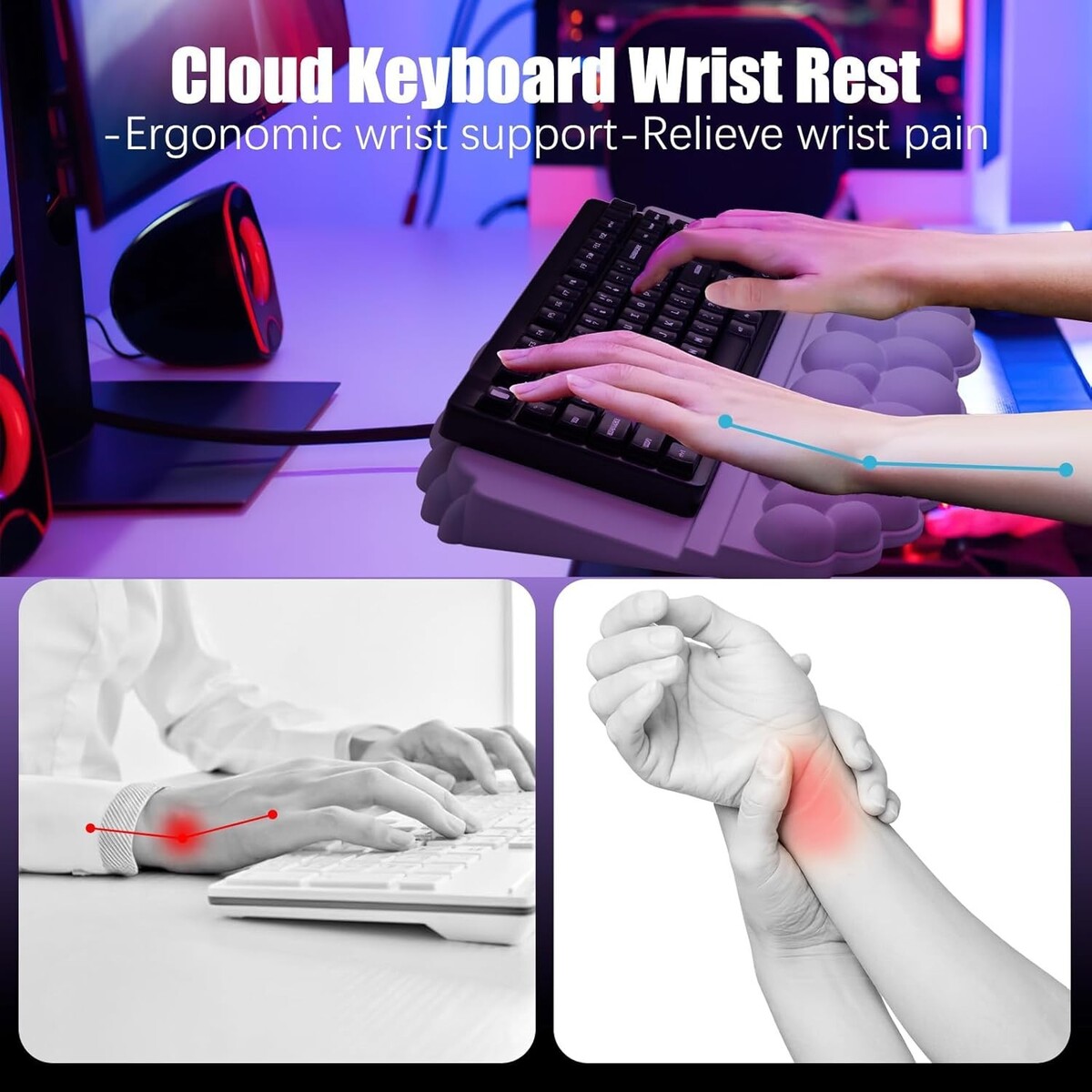 Introducing the all-in-one solution for your comfort and workspace aesthetics. Our Ergonomic Memory Foam Keyboard Wrist Rest comes in an adorable cloud design and serves as a pain relief set tailored for both work and gaming enthusiasts.