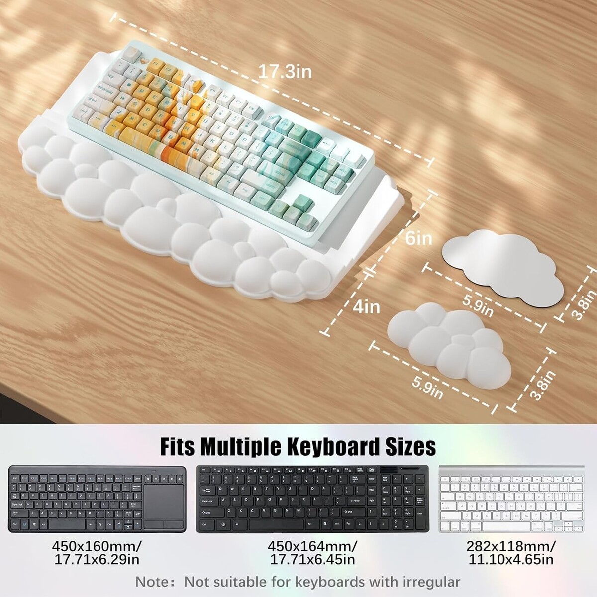 Universal Fit: Dimensions: 17.3"L x 6"W for the keyboard wrist rest and 17.3"L x 4"W for the cloud wrist rest, suitable for most standard keyboards.