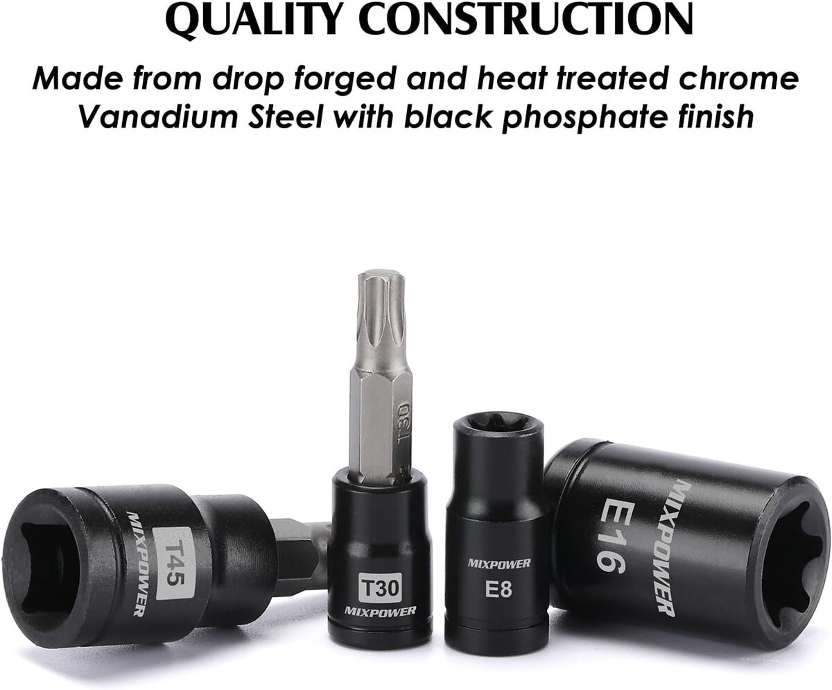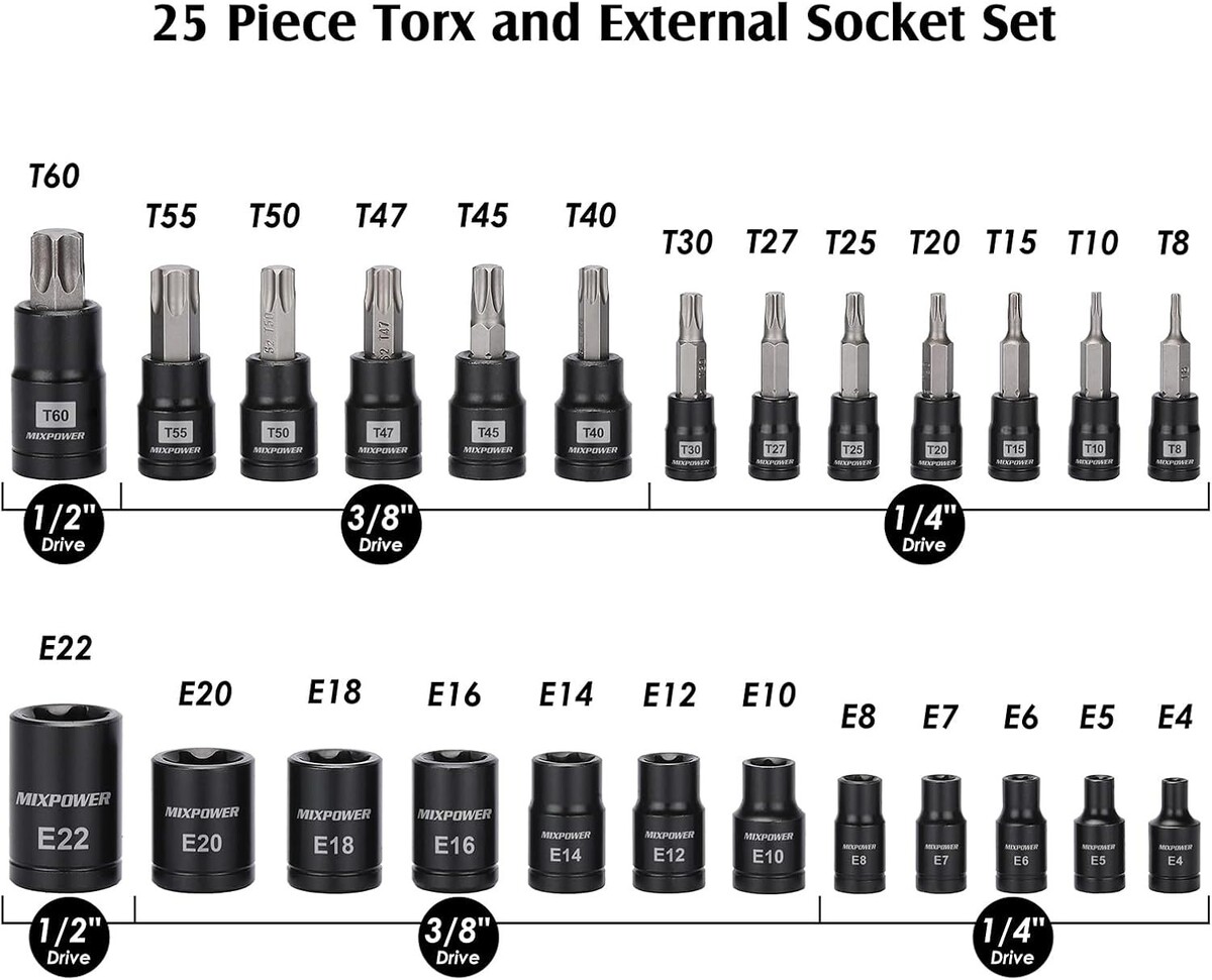 ?Set Includes? 13 Star Socket Bits T: :1/4" Drive: T8, T10, T15, T20, T25, T27, T30; 3/8" Drive: T40, T45, T47, T50, T55, 1/2" Drive: T60. 12 Female E-Torx Sockets E: 1/4" Drive: E4, E5, E6, E7, E8; 3/8? Drive: E10, E12, E14, E16, E18, E20, 1/2? Drive: E22.