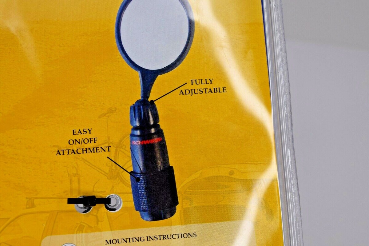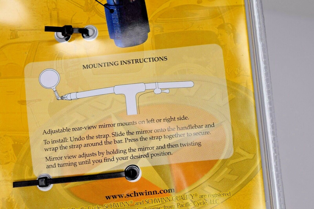 Schwinn Universal Fit Bycycle Mirror with Adjustable View Easy Hook. Brand new never used in original package. Fully Adjustable, Easy On/Off Attachment. Package has a little wear from storage. See all photos for details. Will ship USPS First Class Mail.
