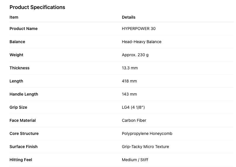 Main Features ---Brand : Li-Ning ---Model : Li-Ning Hyperpower 30 Pickleball Paddle ---Weight : Approx. 230g ---Thickness : 13.3nn ---Length : 418mm ---Handle Length : 143mm ---Material : Carbon Fiber ---Quantity : 1pc