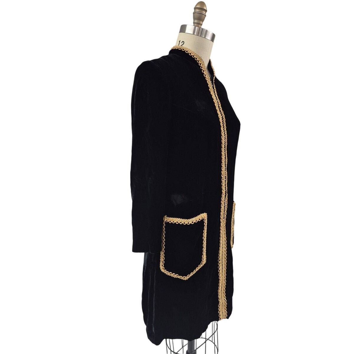 Vtg Black Velvet Dress Coat Gold Trim Pockets Zipper down front 60s 70s Women L