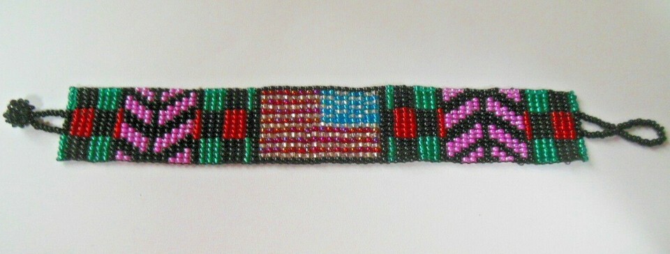 Vintage Woven Multi-color USA Flag Seed Bead Bracelet Pink/Black Arrow 8"