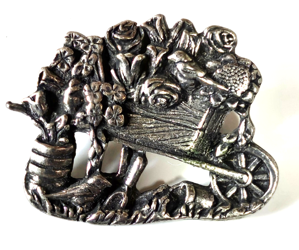 The Birds Blooms Silver-tone Limited Edition 2001 Brooch is a charming piece that features a floral design in a wheel barrel theme. Made of pewter and signed by the brand, this 1 1/8" x 7/8" brooch is a perfect accessory to add a touch of nature-inspired elegance to any outfit. The silver color and simple design make it a versatile piece that can be worn on a lapel, collar, or even as a decorative accent on a bag or purse.